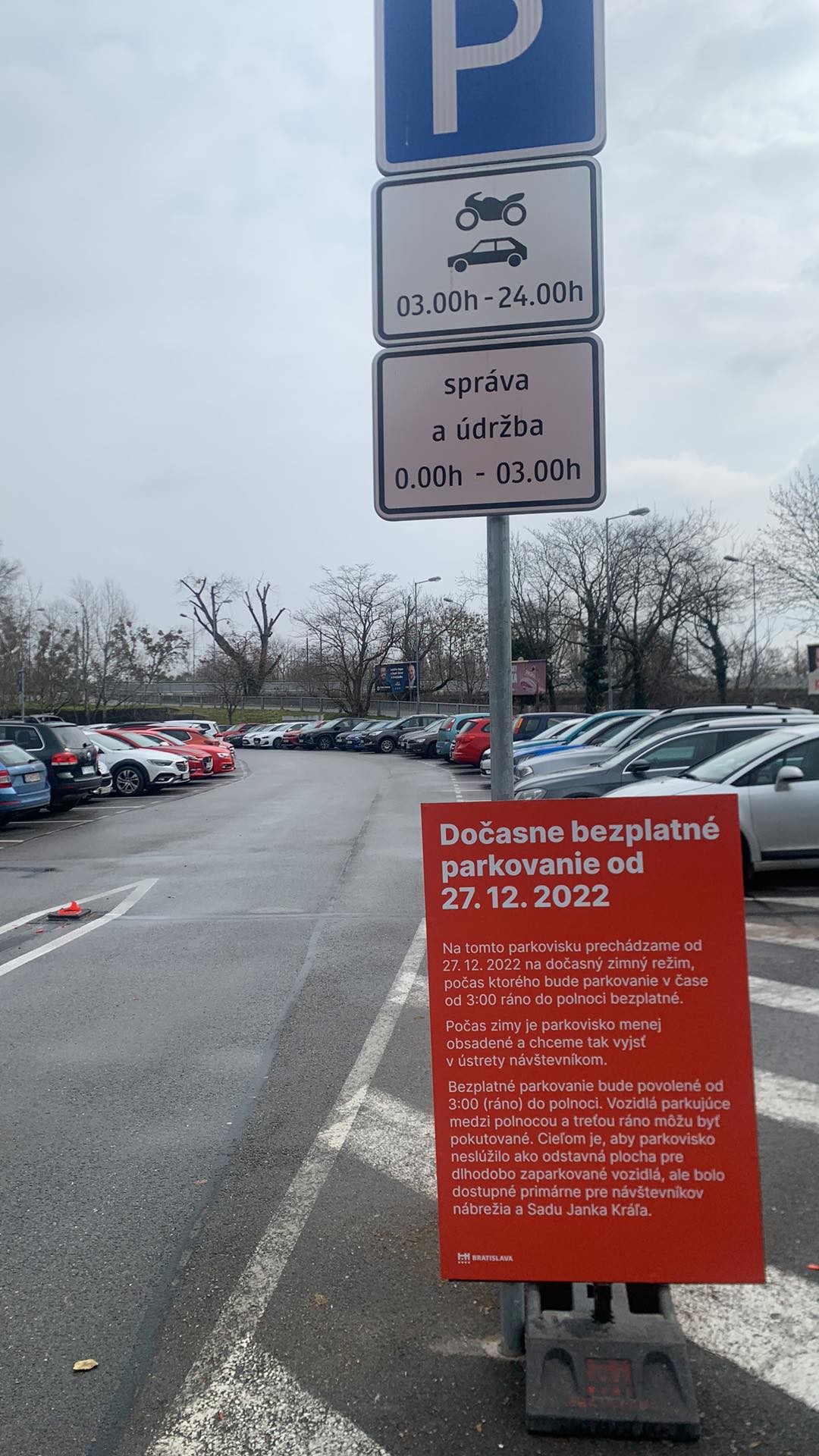 Ako oznamuje tabuľa magistrátu, parkovisko prešlo na takzvaný zimný režim. V praxi to znamená, že parkovanie je zdarma s výnimkou času medzi polnocou a treťou ráno. Vtedy môžete dostať za parkovanie na tomto mieste pokutu.Ide o opatrenie, aby sa z parkoviska nestala odstavná plocha na dlhodobé odkladanie vozidiel.