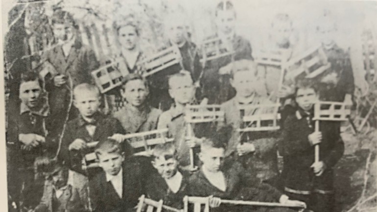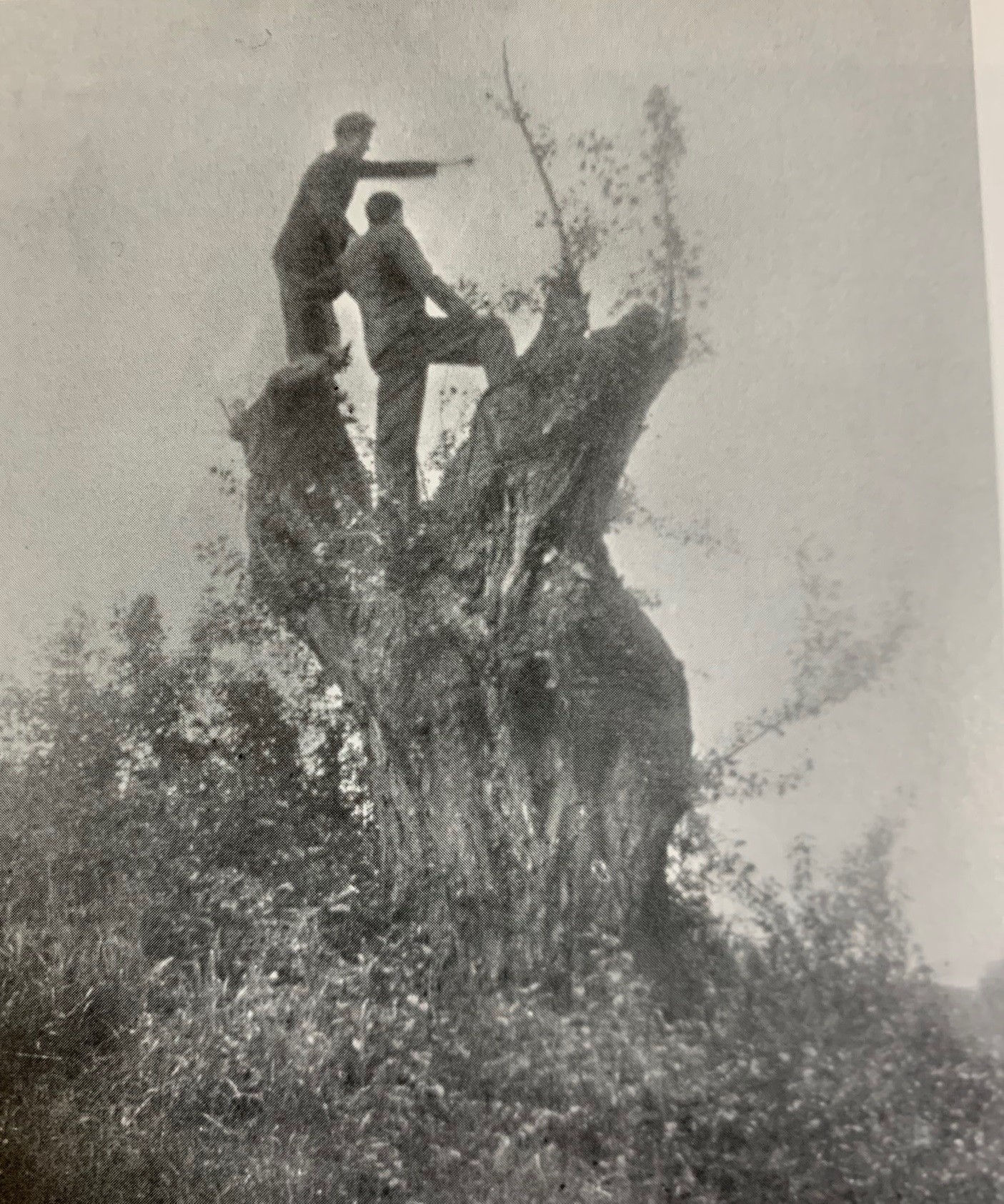 Asi 200-ročné torzo vŕby vo vyschnutom koryte bývalého dunajského ramena na hraničnom pomedzí. Mládenci z Durvayovej tehelne pri obhliadke prútia na veľkonočné korbáče v roku 1930.