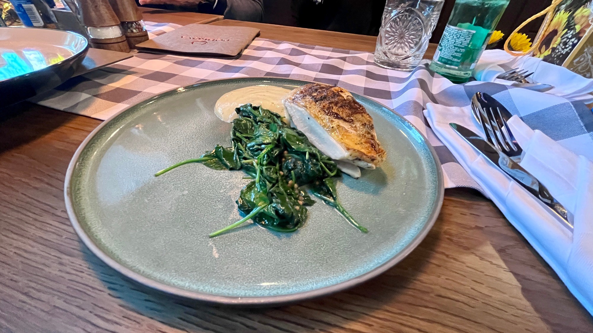 Ďalšou dobrou voľbou boli Grilované kukuričné kuracie prsia (12,90 €) s duseným baby špenátom na masle s cesnakom a s bearnaise omáčkou. Mäso z kuriatka kŕmeného kukuričnou zmesou naozaj chutilo tak nejak kvalitnejšie, bolo šťavnatejšie aj krehkejšie, a porcia na tanieri obrovská. Omáčka mala pre nás zvláštnu chuť, trochu horkú, s jemným nádychom horčice, keby nám nepovedali, že je v nej aj prosecco, nevedeli by sme ju nijako identifikovať. Sama osebe nezaujala, ale spolu s mäsom a špenátom, ktorý bol super, aj cesnak sme v ňom cítili, vyznela príťažlivo. Jednoducho, trojkombinácia, ktorá sa k sebe hodila.