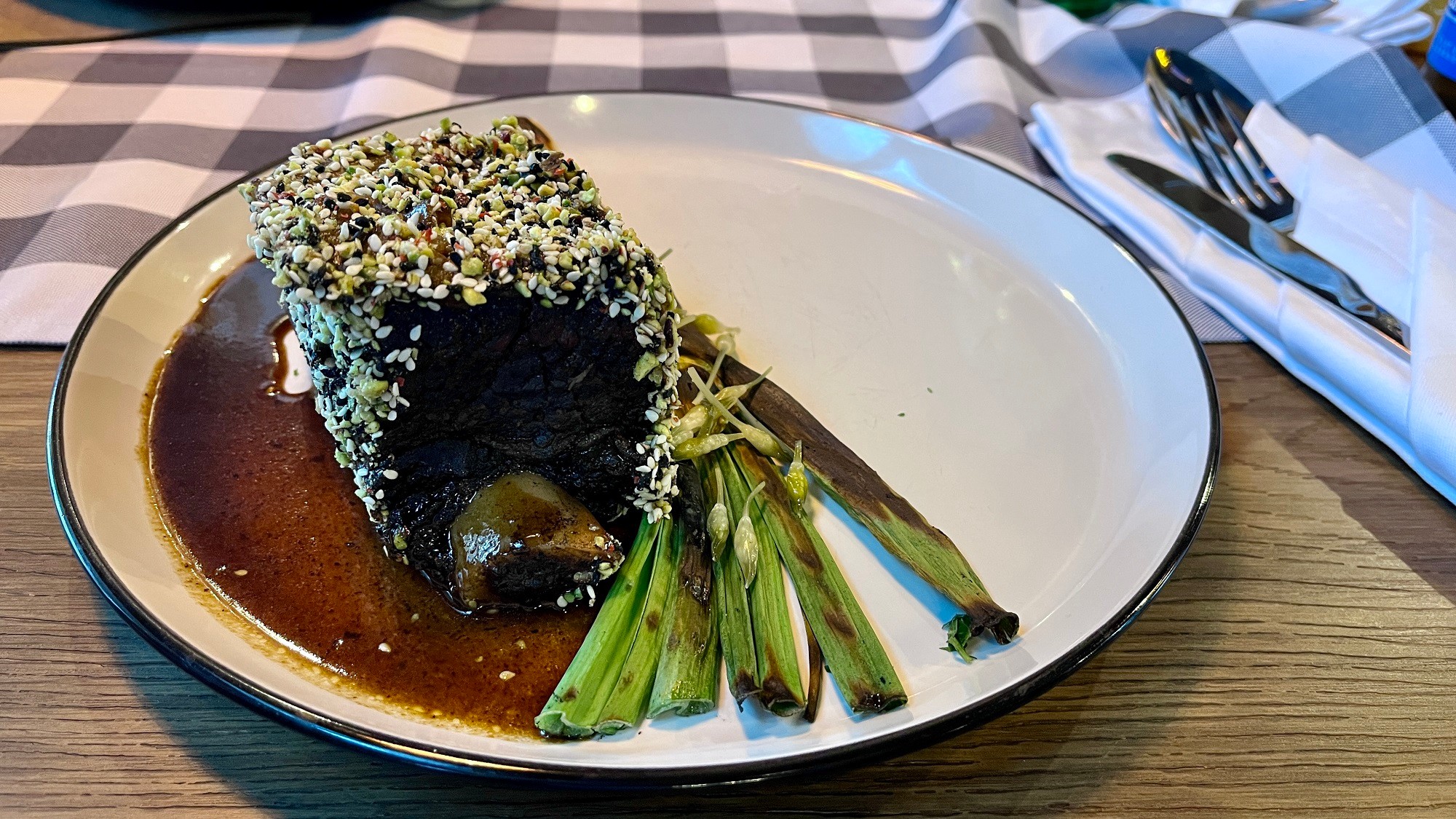 Pomaly dusený hovädzí Short Ribs (16,90 €) bol neskutočnou pastvou pre oči. Po peknej prezentácii bolo ďalším prekvapením zistenie, že „short ribs“ je vlastne jedna kosť, ale také vysoké rebrá sme v živote nevideli. Pripravené boli excelentne, krusta z posekaných pistácií a ružového korenia im dala ešte ďalší chuťový rozmer. Výnimočná bola aj omáčka z koreňovej zeleniny a vína, grilovaná jarná cibuľka a kapary boli už bonusom navyše. K špecialitke nám opäť prišla vhod vydarená domáca produkcia hranolčekov.