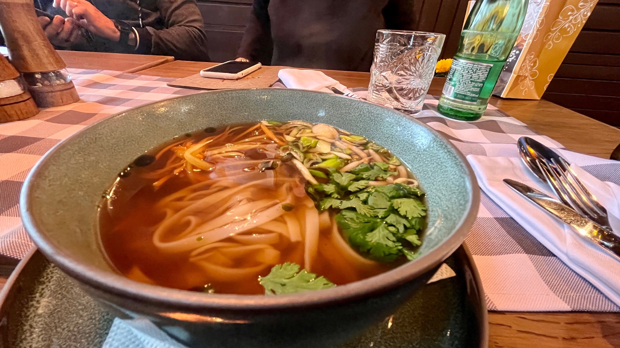 Začali sme polievkou Pho (5,90 €), vývarom z kukuričných kuriatok s ryžovými rezancami, klíčkami mungo, jarnou cibuľkou, mrkvou i zeleným koriandrom. Vývar bol veľmi silný, výrazný a voňavý, ten zvyšok však chuťovo zaostával, jedli sme už aj lepší. Túto verziu ázijskej polievky hodnotíme ako nie zlú, ale ani nič mimoriadne.