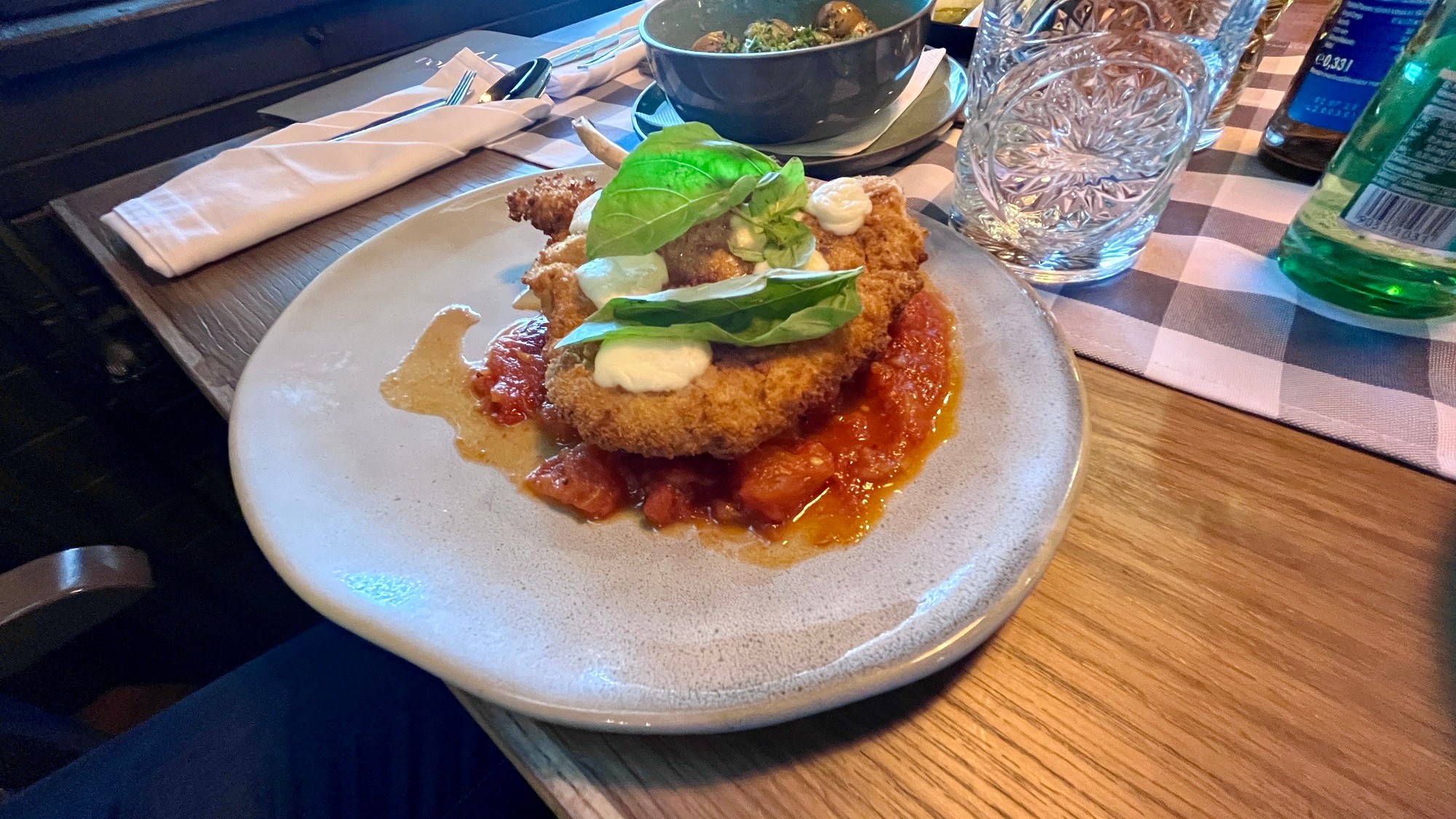 Bravčová kotleta Parmigiana (15,90 €), vyprážaná v domácej panko strúhanke a vyzdobená listami bazalky i baby mozarellou, pôsobila na pohľad príťažlivo. Mäsko chutilo celkom fajn, ale... na to, že zrelo 21 dní (takto nám ho prezentovali), sme čakali čosi jemnejšie a šťavnatejšie. Omáčka z grilovaných paradajok mala čistú, intenzívnu chuť, nič nadbytočné, s chrumkavou kotletou sa perfektne zladila, hodil by sa nám však navyše svieži šalát. Ako prílohu sme si dali Baby zemiaky (4,90 €) na masle s petržlenovou vňaťou, pri ktorých si uvedomíte, že na skvelú pochúťku niekedy netreba veľa.