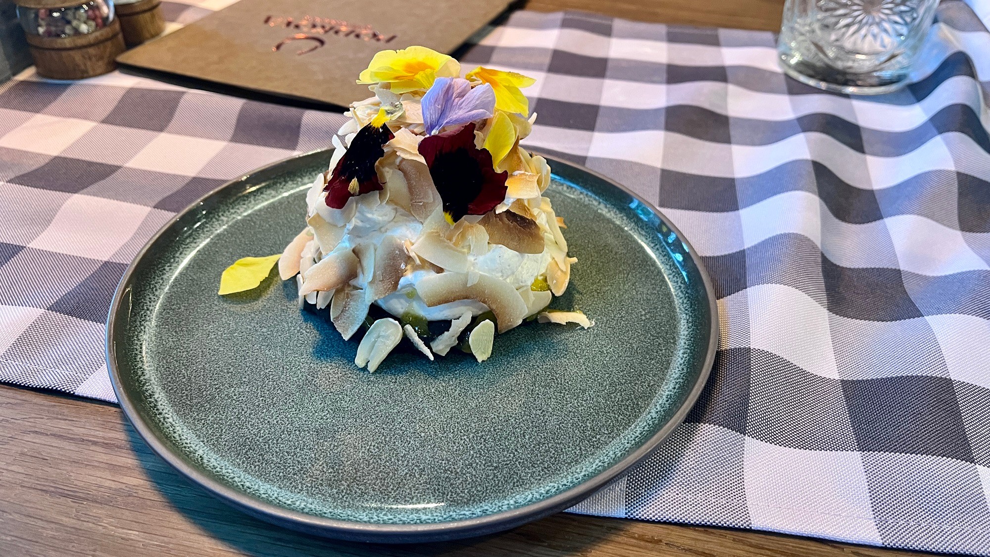 To najlepšie na koniec – takto vysoko hodnotíme maškrtu s názvom Cheesecake à la podkova (5,90 €), ktorá nám ulahodila všetkým, čo ju vytvorilo: od delikátneho krému z kokosu, vanilky a citróna cez marakujovú omáčku až po domácu sušienku s aktívnym čiernym uhlím. Lepší dezert sme dávno nejedli: keď sa nám podarilo nabrať si všetko na vidličku, jednotlivé chute sa postupne akoby rozbaľovali. Najvýraznejšia bola chuť sušienky, ktorá na chvíľu všetko prebila, potom nenápadne prešla do chuti citrusu, napokon nám v ústach ostala jemná chuť kokosu. Zákusok ako sen, pri ktorom sa tešíte na ďalšie sústo hneď po tom, ako si vychutnáte to predchádzajúce.