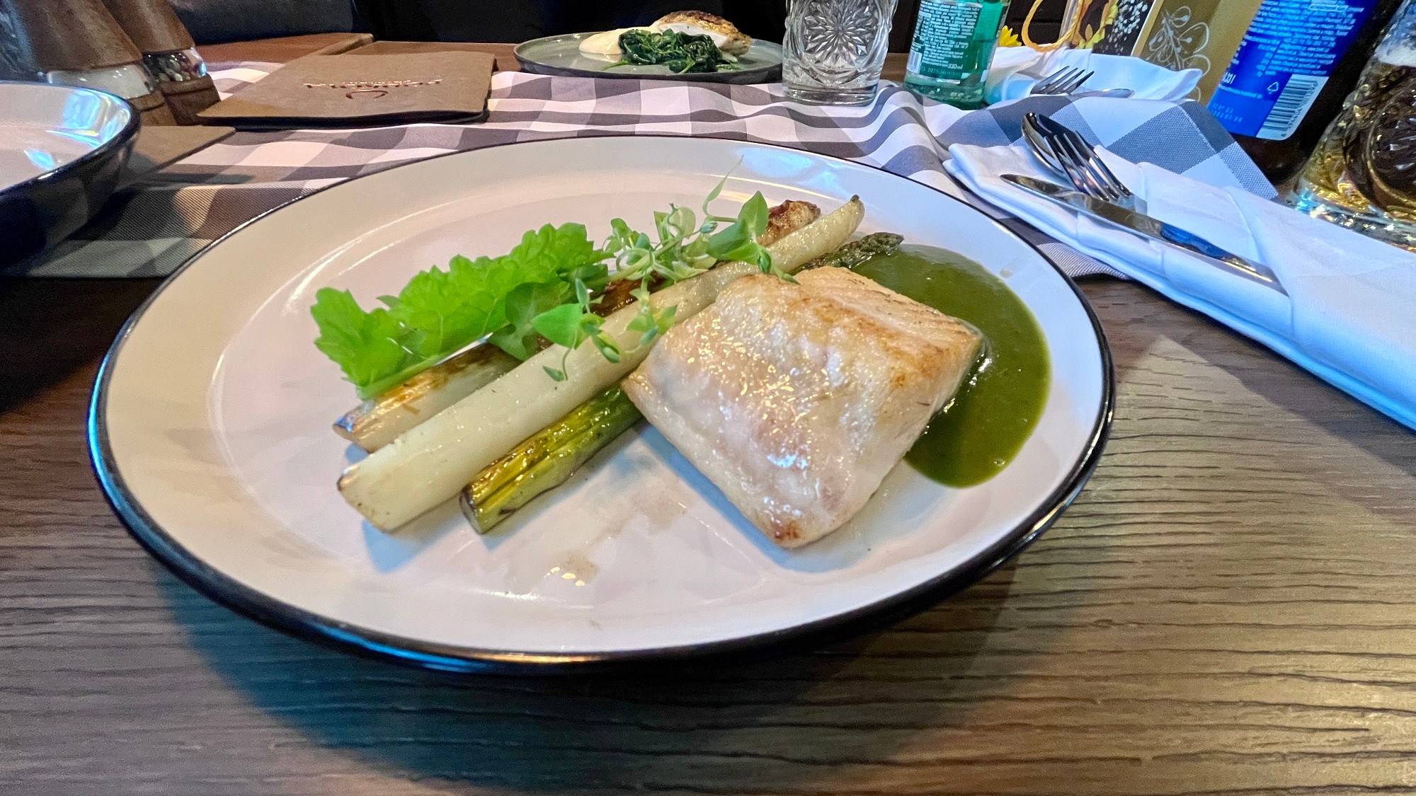 Z rýb bol v deň našej návštevy v ponuke Jeseter (15,90 €) s mixom bielej a zelenej špargle a toto jedlo sme si skutočne vychutnali. Ryba bola perfektná, v kombinácii so zeleninou vytvorila peknú jemnú chuť, pričom rybacia omáčka pripravená zo zeleného karí a s medvedím cesnakom dávala delikatese príjemný pikantný záver. Trochu sklamalo množstvo špargle – málo! Domáce hranolčeky (4,90 €) ako príloha k rybe boli vydarené, chrumkavé, správne dosolené, tipujeme, že aj zemiaky dodáva reštaurácii overená farma.
