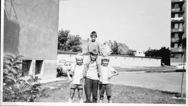 Architekt Vladimír Pongrác (62), na fotogarafii z Očovskej 12 najstarší v strede, spomína na svoje detstvo v Petržalke v rokoch 1968 až 1976. Jeho životopis na stránke www.arch.jetzt sa oplatí prečítať celý. Vráti vás do čias starej Bratislavy, dokáže totiž písať veľmi vtipne aj o smutných aspektoch doby.