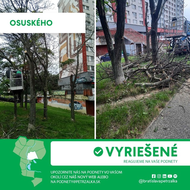 V Petržalke robia pracovníci miestneho úradu všetko pre to, aby sa obyvateľom žilo lepšie a bezpečnejšie. Práve vďaka obyvateľkám a obyvateľom, ktorí neváhajú použiť niektorú z platforiem na nahlasovanie podnetov, má mestská časť prehľad o tom, kde všade sú pracovníci z oddelenia správy verejných priestranstiev, teda familiárne makači, v tejto chvíli potrební. Informáciu priniesla mestská časť na svojom Facebooku.