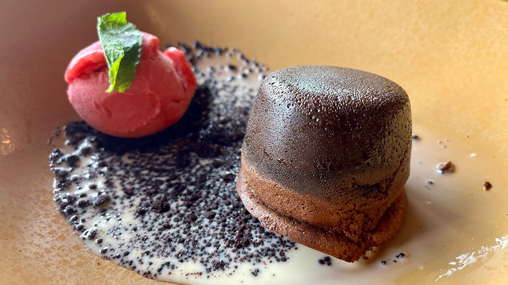 Vynikajúca bola Čokoládová tortička (7,90 €) s malinovým sorbetom a ľahkým vanilkovým pudingom creme anglaise. Koláčik teplý, vnútri lahodná čokoláda, k tomu zmrzlina – túto kombináciu sme si naozaj užívali. No a na úplný záver, už pri platení, prišlo iné prekvapenie - oba dezerty nám venovali ako pozornosť podniku za trpezlivosť pri čakaní na jedlo.