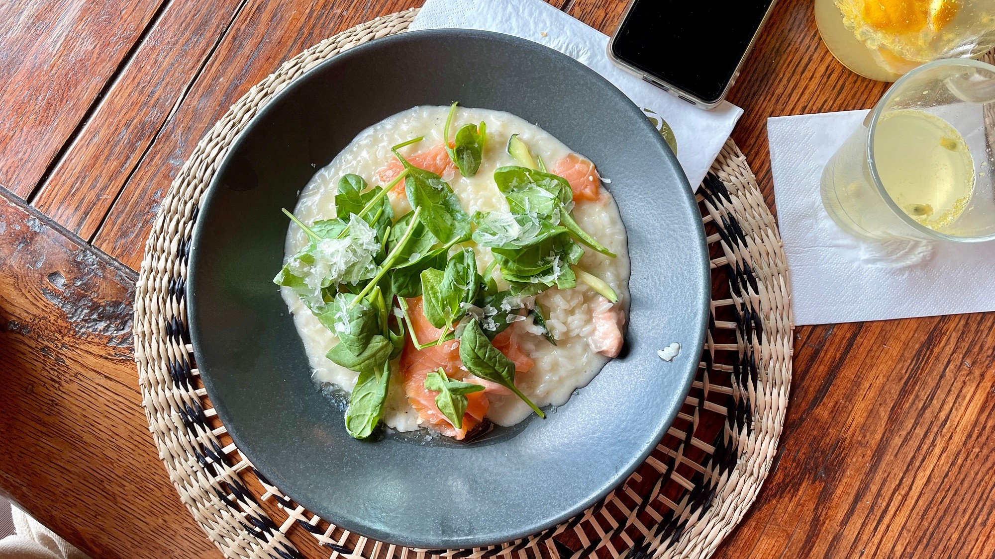 Chválime aj Risotto s údeným lososom (13,50 €), bolo skutočne úžasné a porcia primeraná, ani malá, ani veľká. Taliani pripravujú toto ich tradičné jedlo zo špeciálnych odrôd ryže, v našom prípade to bola arborio ryža, do ktorej pridali aj biele víno. Ryža bola uvarená tak, ako treba, do krémovej konzistencie, a chuť spolu s kúskami lososa znamenitá. Jednoducho, výborný a výživný obed, ktorý si radi zopakujeme.