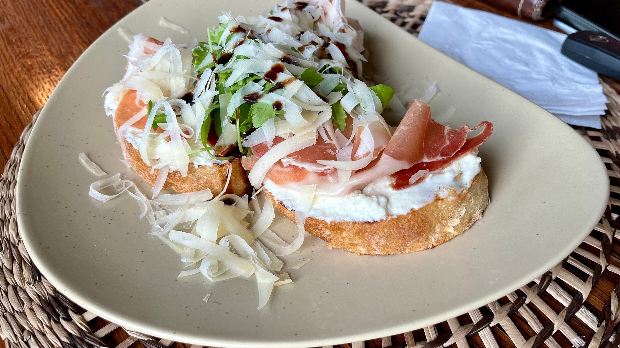 Ako predjedlo určite odporúčame Bruschettu s mozzarellou a prosciutto crudo (8,50 €). Prekvapila už veľkosť porcie a potom skvelá chuť nátierky, ktorou rozhodne nešetrili. Chlebík bol príjemne chrumkavý, šunka prosciutto takisto výborná, spolu so zeleninkou a tvrdým syrom grana padano vytvorili fajn chuťový zážitok.