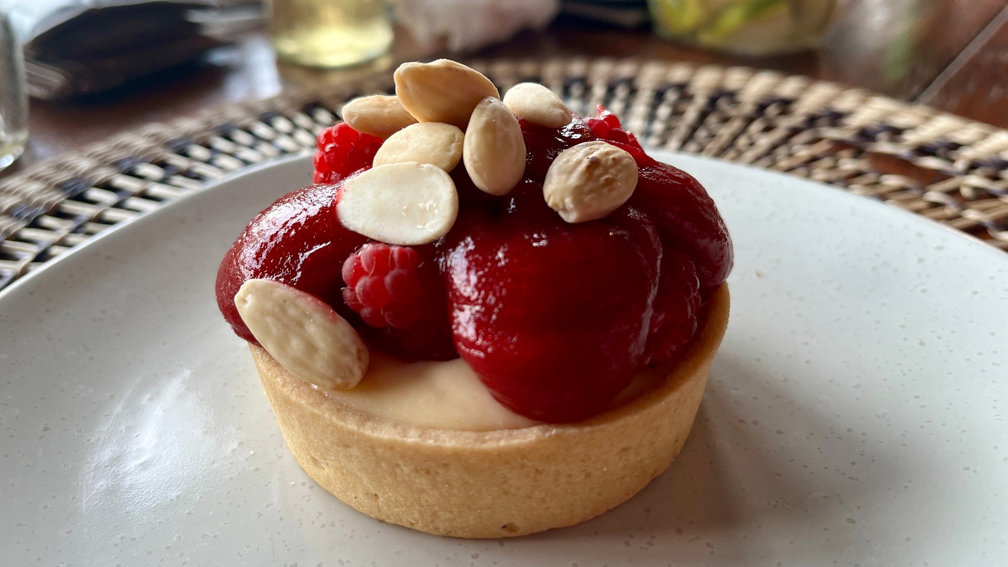 Na úplný záver sme si dopriali dva dezerty, ktoré už na pohľad pôsobili efektne. Pri Citrónovej tartaletke (6,50 €), kde chuť citrónového krému v košíčku doplnili čerstvé maliny, domáce malinové želé a pečené mandle, sme ocenili, že všetko je čerstvé. Očakávali sme síce väčší chuťový kontrast, ale citrónový dojazd bol taký, ako sa patrí.