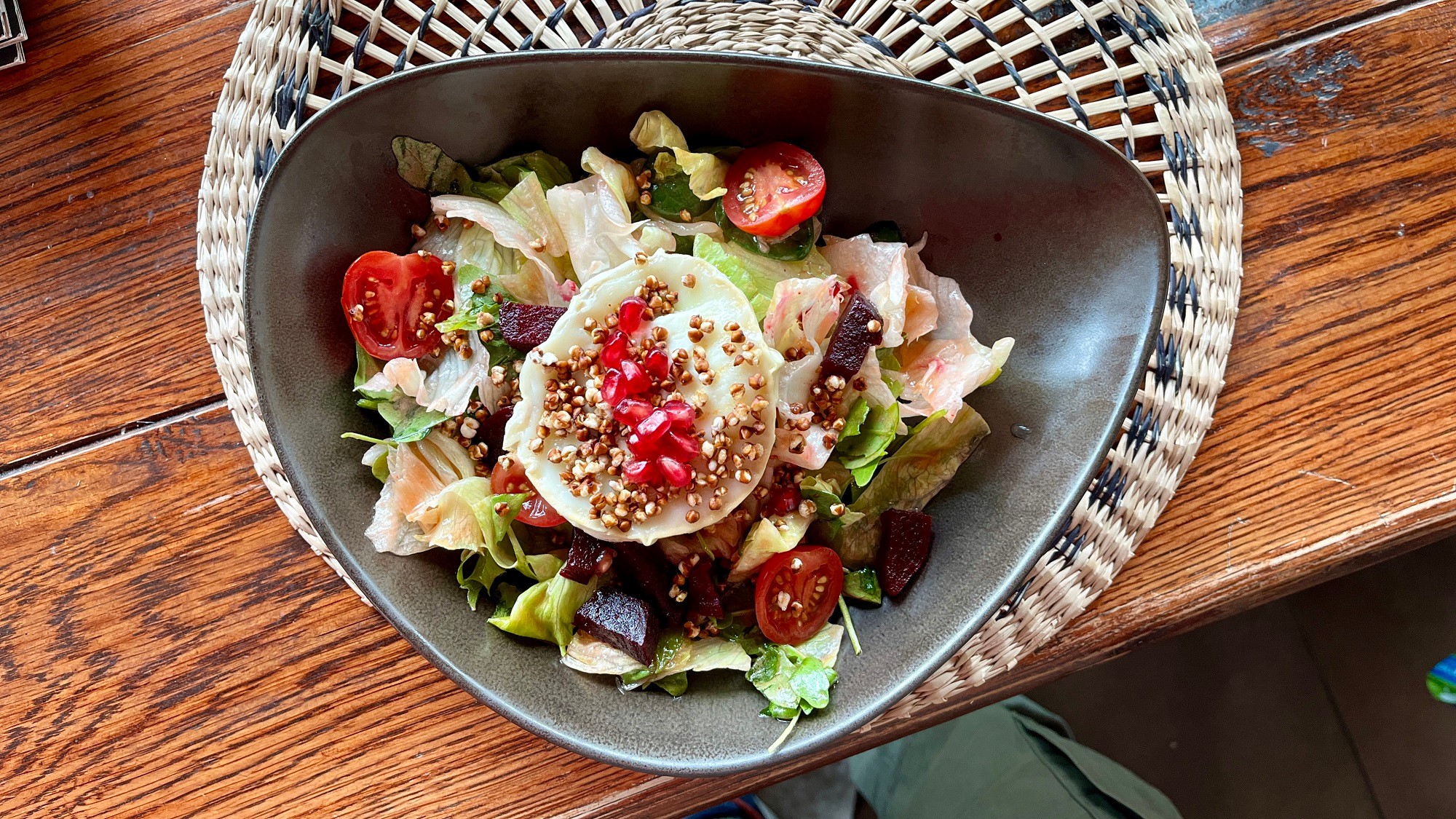 Porcia Šalátu s kozím syrom (12,90 €) potešila nielen veľkosťou, ale aj prezentáciou. Nevedeli sme si celkom predstaviť, akú úlohu zohrá pridaný jahodový dresing, ale pri kombinácii miešaného listového šalátu s cherry paradajkami, marinovanou cviklou, kozím syrom a granátovým jablkom nás čakal doslova výbuch chutí. Asi by sme vynechali pohánkový popcorn, ktorý síce prinášal novú textúru, ale nám prekážal. Jediné, čo by sme prijali, je opečená bagetka, aby sme sa najedli sýtejšie.
