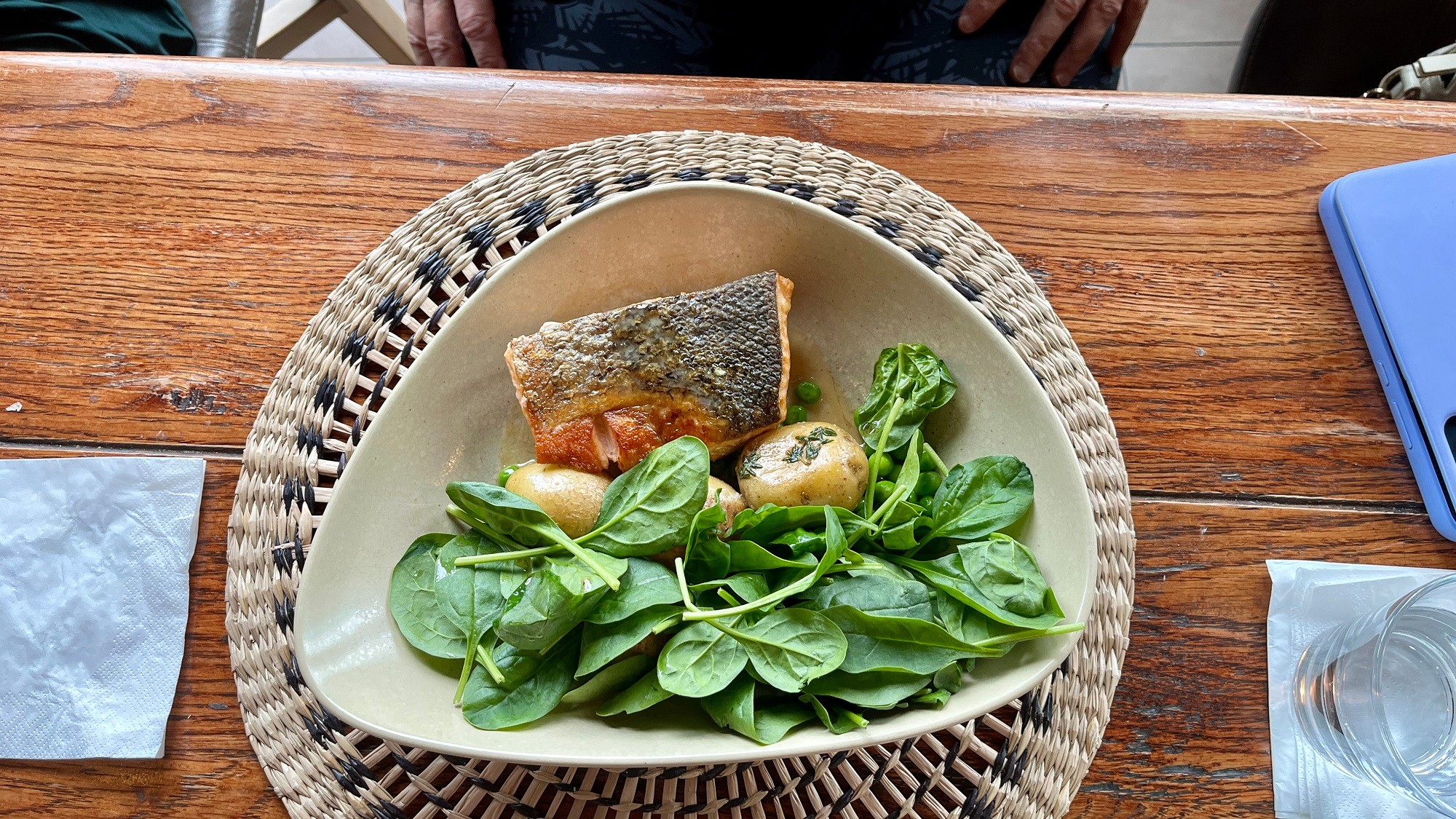 Ďalšia naša voľba, Losos na grile (19,50 €), bolo delikátne, chuťovo jemné jedlo. Pri grilovanej rybke sme odolali pokušeniu pridať soľ či nejaké to korenie a užívali sme si jej jednoduchú, dobrú chuť. Príjemné boli i baby zemiaky pečené na tymiáne, takisto baby špenát, ktorého sme mali plný tanier. Všetko dohromady vyzdvihol limetkový konfit spolu s maslovou omáčkou, nič viac nám k spokojnosti nechýbalo.