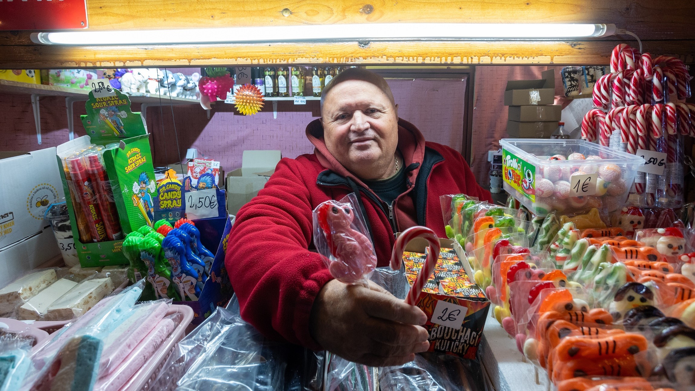 Eugen je na petržalských trhoch už po piaty raz. „Oslovujú ma ľudia, že si ma pamätajú, z vlaňajška a predvlaňajška, je to príjemné,“ hovorí obchodník, ktorý mal aj bufet na trhovisku na Mlynarovičovej. „Kedysi som predával aj na vianočných trhoch na Hlavnom námestí, ale v Petržalke sa mi páči viac. Nielen preto, že bývam kúsok odtiaľto. V meste už nemôžem predávať všetok tovar, napríklad oplátky nie sú cukrovinky. Musel by som mať viac stánkov. Tiež som tam mohol robiť zásobovanie len od 6:00 h do 8:00 h ráno, keď som to nestihol, vláčil som tovar pešo,“ vysvetľuje.