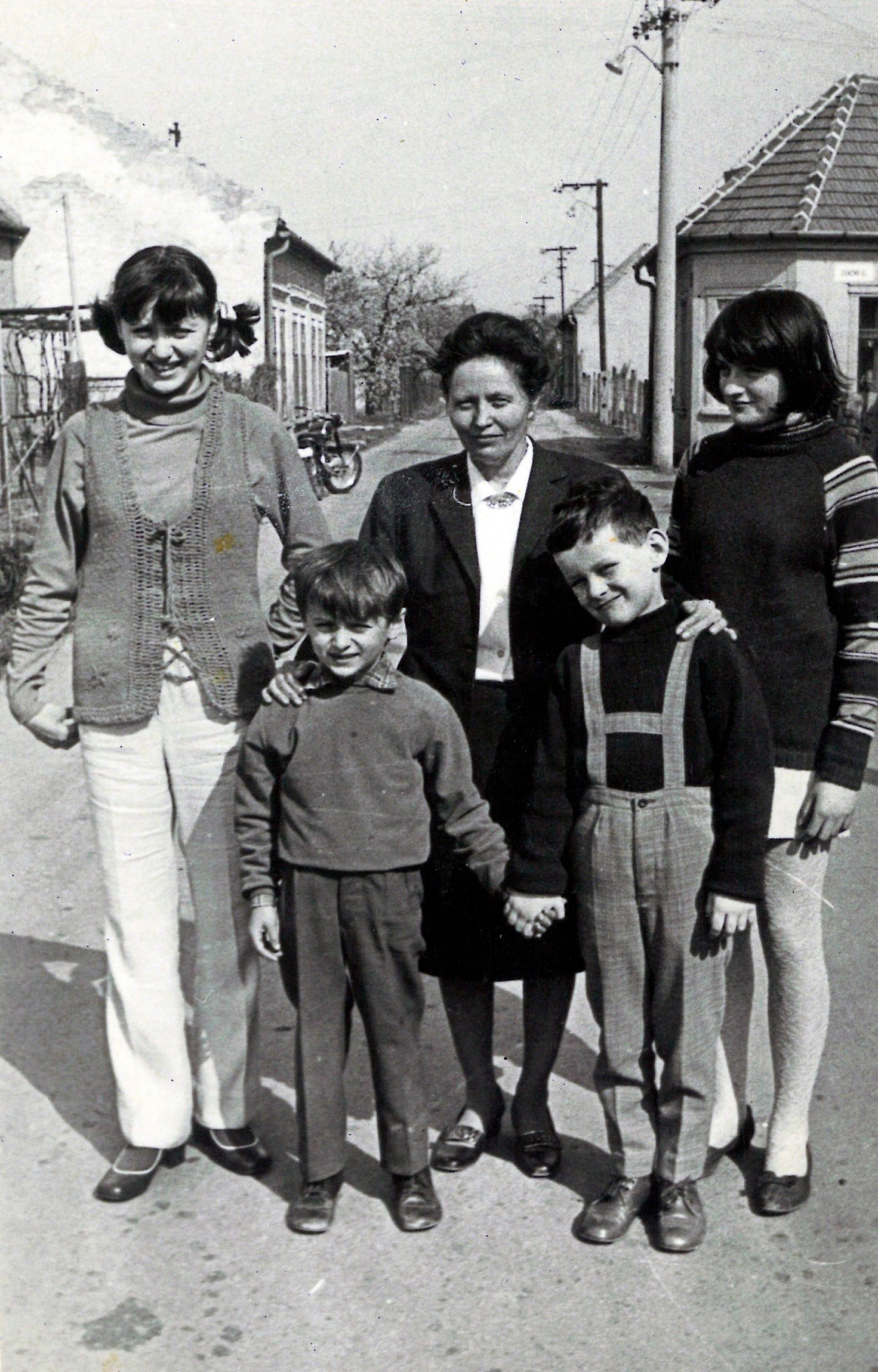 Pred ich domom na Vlasteneckej. Pavel je najmenší, vľavo sestra Nataša, mama Mária, sestra Anka a kamarát od susedov Milan Dedič.