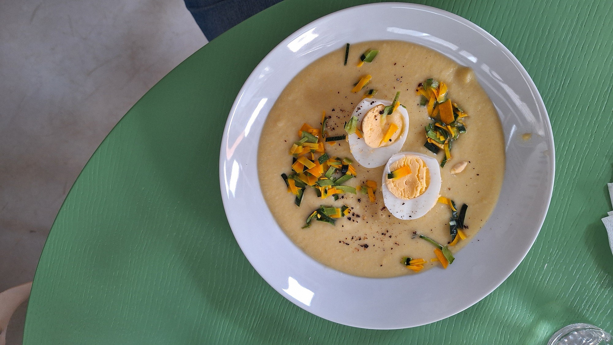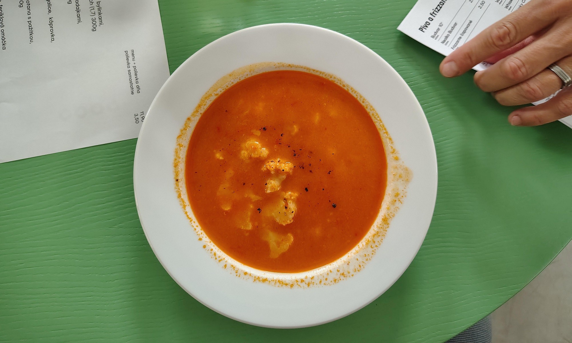 Zeleninová polievka bola diétnejšia, plávalo v nej asi šesť kúskov karfiolu a v klasickom tanieri jej bolo tak na pár lyžíc, ale chuť dobrá, príjemne osviežujúca a trochu kyselkavá, to nás zaujalo.