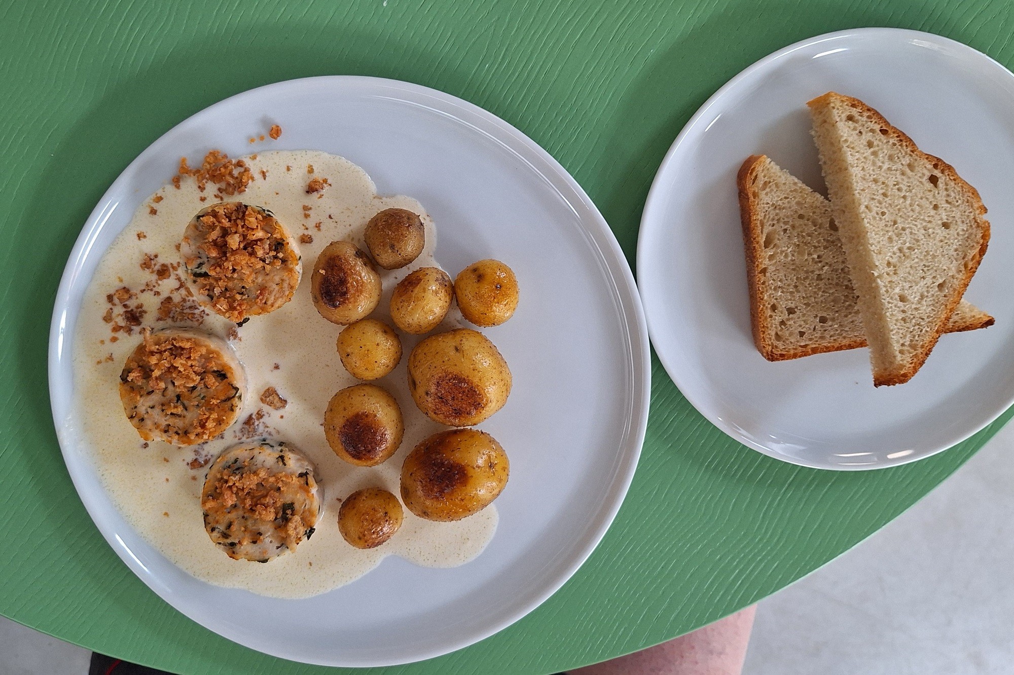 Soliť tunajších kuchárov asi baví, potvrdili nám to aj na ďalší deň, keď sme ochutnali Kuraciu rolka s petržlenom. Výrazne slaná bola nielen rolka, ale takisto feniklová omáčka pripravená s bielym vínom a rovnako baby zemiaky. Bola to však naozaj pochúťka s trochu tuhším, ale lahodným mäsom. Omáčka zaujímavej chuti bola jemná a osobitne chválime posýpku z upražených kuracích koží, dobrý nápad, bola skvostná.