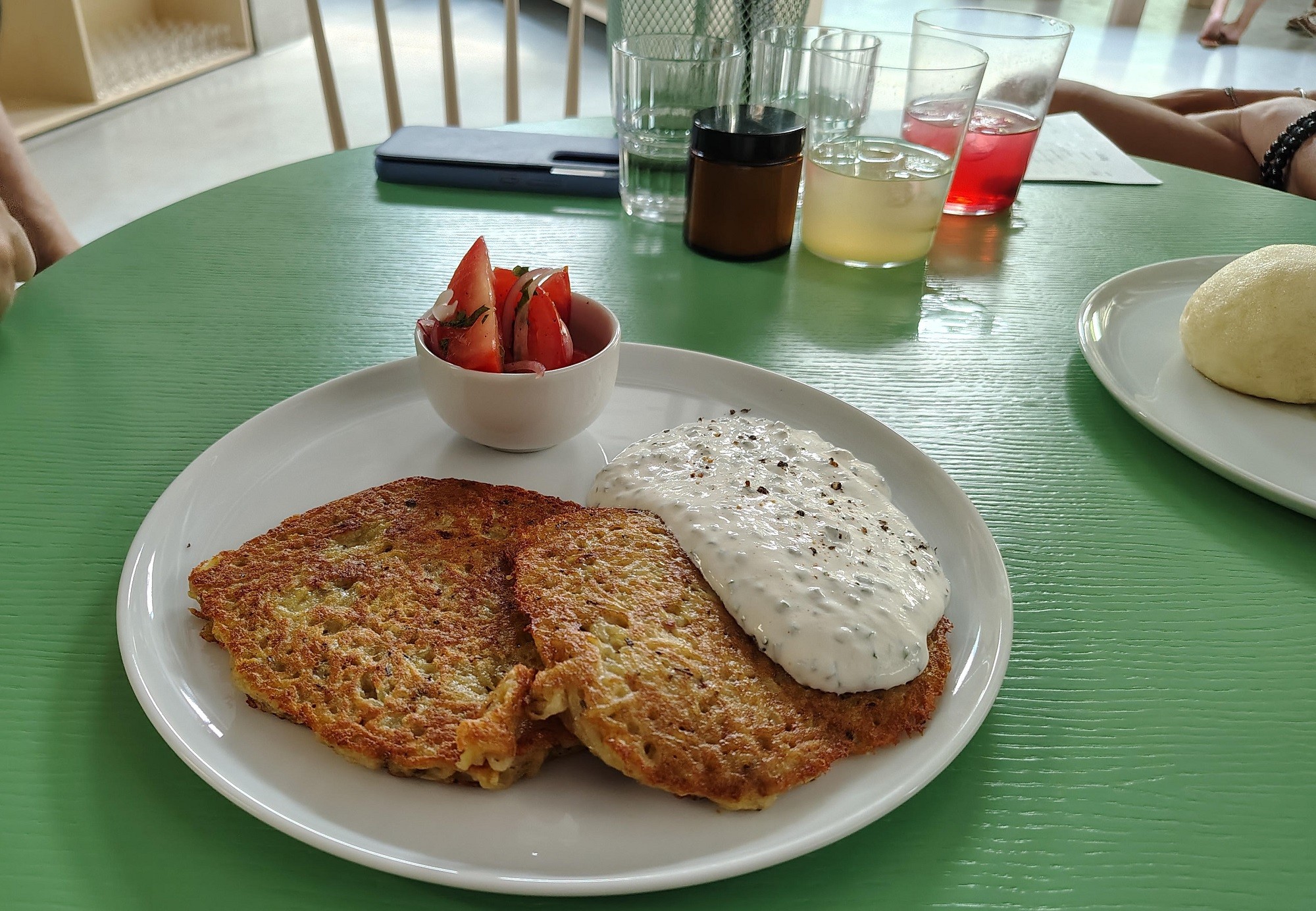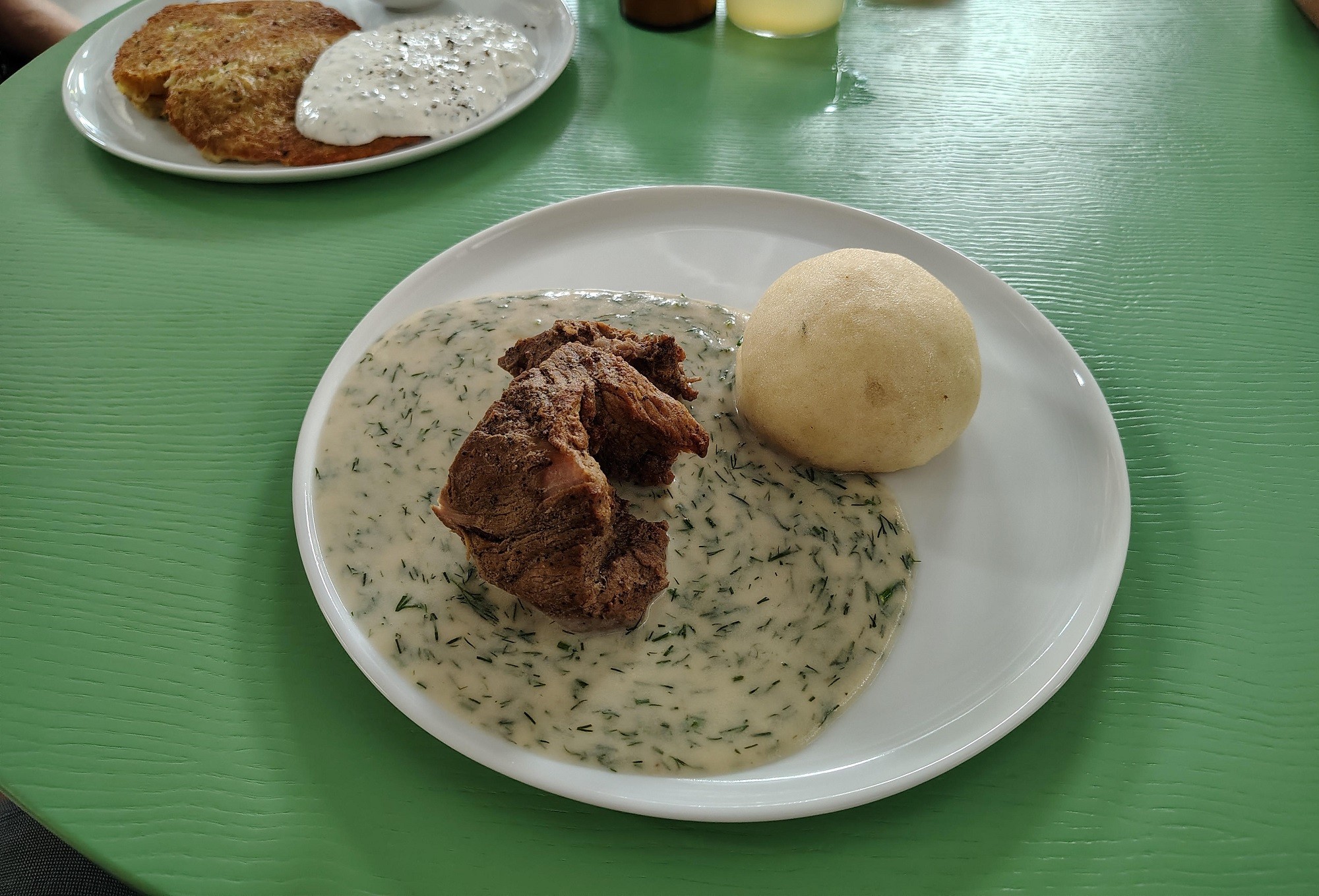 Zemiakové placky v rámci „vege“ ponuky boli dobré, nespečené, skutočne zemiakové, nechýbalo im nič, hoci kolega vyhlásil, že by pridal štipku korenia. K plackám podávali smotanový dresing s nasekanou pažítkou. Bol svieži a chutný, ale mohol byť radšej v osobitnej miske, nie priamo šupnutý na placku, aby ju nezbavil chrumkavosti, pre ktorú ju máme radi.