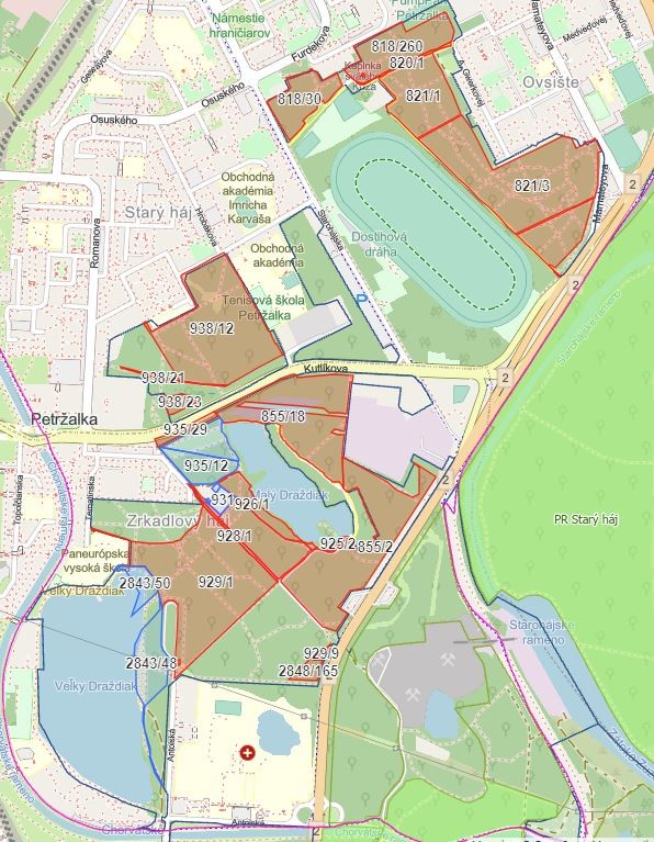 Lesopark Petržalka. Červenou ohraničené plochy sú v správe Mestských lesov.