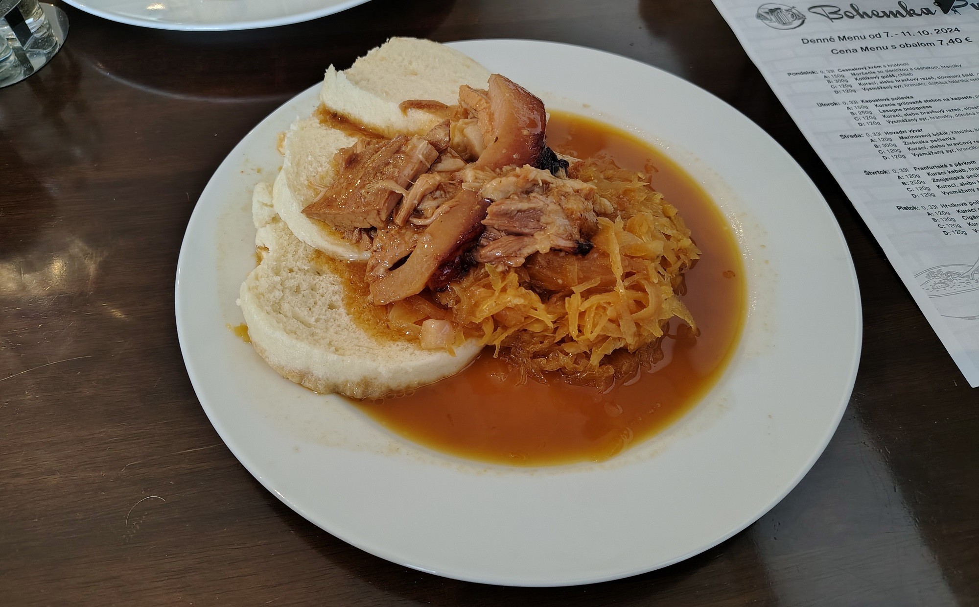 Marinovaný bôčik bol trochu mastnejší, ale mäso bolo výborné, takže sme nemali problém zjesť aj kúsky, ktoré by sme inak vynechali. Kapusta bola príjemne kyslá, neprebíjala chuť mäsa, knedľa ľahká, nadýchaná, a všetko toto spolu vytvorilo mix chutí, ktoré sa pekne dopĺňali. Aj v tomto prípade bola veľkosť porcie nadštandardná a jedlo takmer bezchybné, keby bolo toho mastného menej.