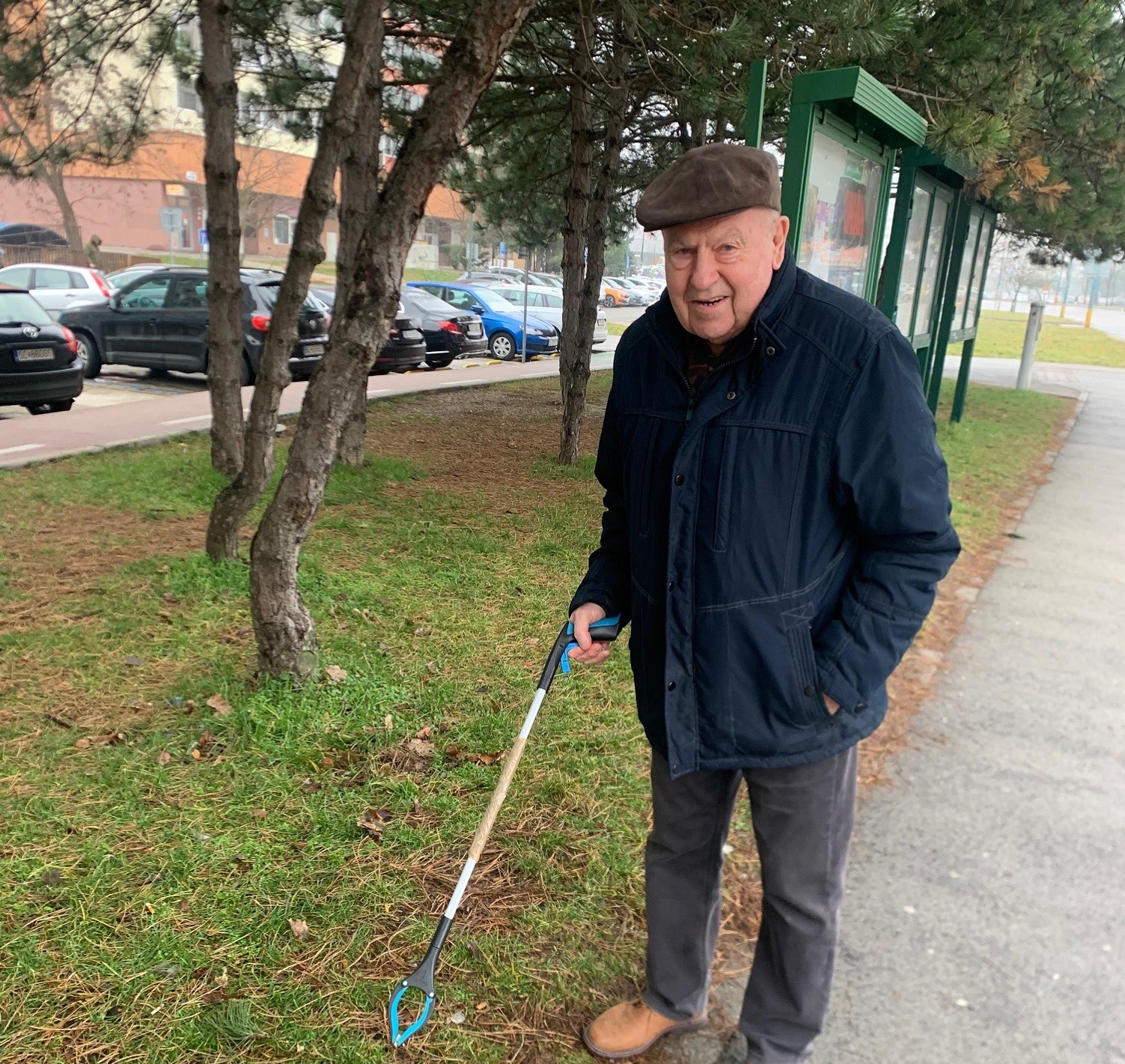 Pán Chmelík prichádza na naše stretnutie aj so špeciálnym „štipcom“ na palici, vďaka ktorému dokáže zbierať aj ohorky z cigariet. „Stojí nejakých päť eur. Toto je už môj štvrtý,“ hovorí s úsmevom a dodáva, že keď to raz rátal, vyzbieral za deň 620 ohorkov!