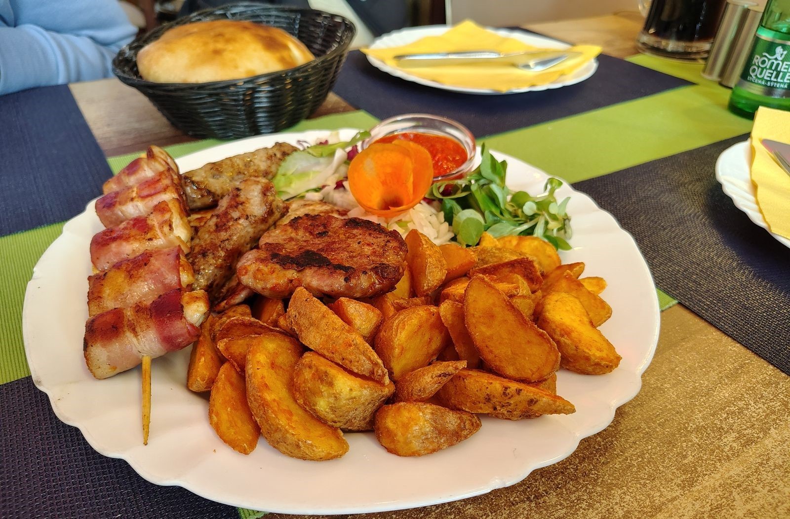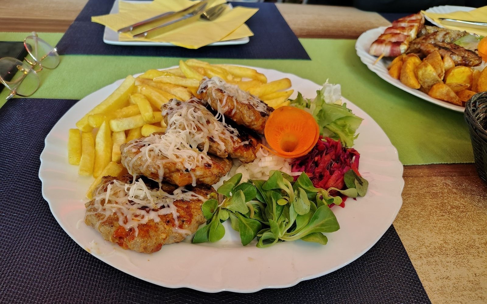 Vychutnali sme si tiež Gurmánske uštipci (10,80 €) s hranolčekmi. Štyri poctivo veľké placky z mletého bravčového a hovädzieho boli o čosi šťavnatejšie a mäkšie ako tá v mixe špecialít. Chuť grilovaného mäsa, ktoré bolo jednoznačne vysokej kvality, nám pripomenula dovolenku pri Jadrane. Možno mohla byť ostrejšia, ale to sa dá zariadiť čili omáčkou, ktorú si doobjednáte, ak chcete. Hranolčeky boli dosolené presne ako treba a chutili ozaj zemiakmi, nie spáleným tukom. Potešila i pestrofarebná zeleninová príloha, opäť aj so surovou cibuľou, čo je u nás celkom nezvyčajné, ale k mletému mäsu na grile nevyhnutne patrí. „Určite sem vezmem otca, aby si spomenul na chute našich dovoleniek v Juhoslávii,“ konštatoval kolega Matúš, ktorý zároveň ocenil veľkosť porcie, bola obrovská.