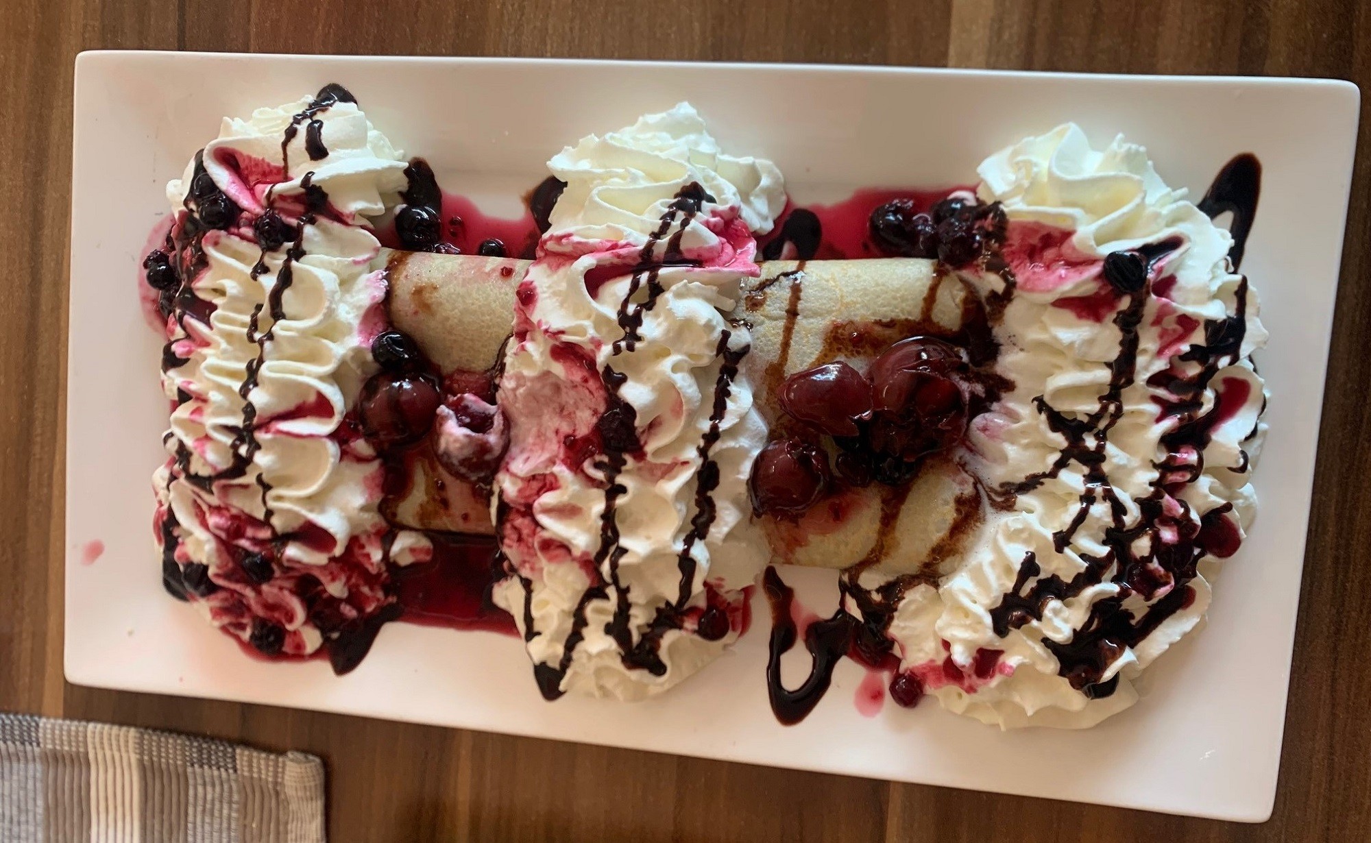 No ale keď už ste v pizzerii a palacinkárni, ako hovorí názov podniku, a ešte vládzete, doprajte si aj palacinku, robia sladké, slané i vyprážané. Kamarátka Ingrid zavŕšila spomínanú reportáž pre Petržalské noviny Schwarzwaldskou palacinkou (7,50 €) a pochvaľovala si. „Cesto je síce hrubšie, ale malo bohatú čokoládovo-ovocnú plnku a na vrchu kopec ovocia so šľahačkou, ktorou tiež nešetrili, no cukrový šok, keď to zješ celé. Pokojne sa to dá poňať aj ako hlavné jedlo, bohato zasýti.“