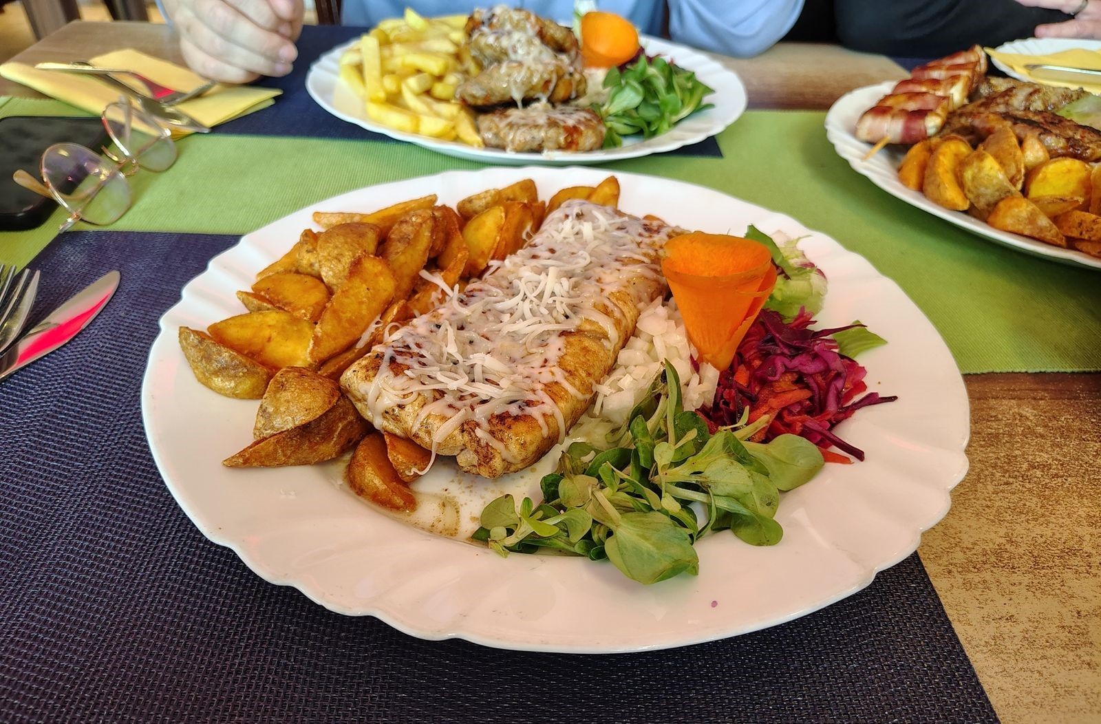 Pri Kuracích prsiach Tiffany (10,60 €) sme chvíľu špekulovali, ako je možné získať až taký veľký kus mäsa z danej časti kurčaťa, ktorý nám potom naplnili syrom a hovädzím pršutom, majster kuchár asi čaruje... V každom prípade špecialita, ku ktorej sme si dali opekané zemiaky, bola výborná, mäsko šťavnaté a dobre ochutené, spolu so skvostnou náplňou naozaj vynikajúce, jednotlivé chute sa pekne zladili. Vyzdvihujeme čerstvosť surovín a ešte poznamenávame, že v náplni nebola najlacnejšia šunka, akú vám často ponúknu v iných reštauráciách, takže super. Ak vás ozaj neláka balkánska kuchyňa v takej či onakej verzii mletého mäsa, vyskúšajte toto jedlo.