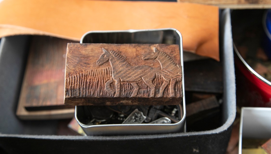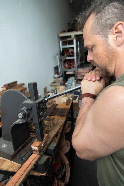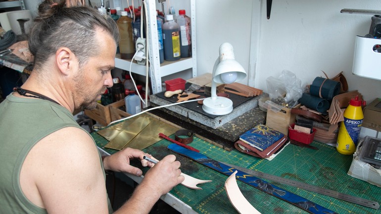 Ďalším v rade neznámych výrazov sú raznice. Drevené alebo kovové kusy s vlastným motívom, ktoré otláča do kože. „Na to mám tento lis so silou troch ton,“ ukazuje na roh miestnosti. Nájdete tu ceruzku vedľa pílky, nožíky, farby na kožu, nástroje, ktoré som v živote nevidela... uznávam, že je multifunkčný. Okrem remeňov vyrába aj brošne, vešiaky, rôzne ozdoby, napríklad kamene osadené do kože, náramky...
