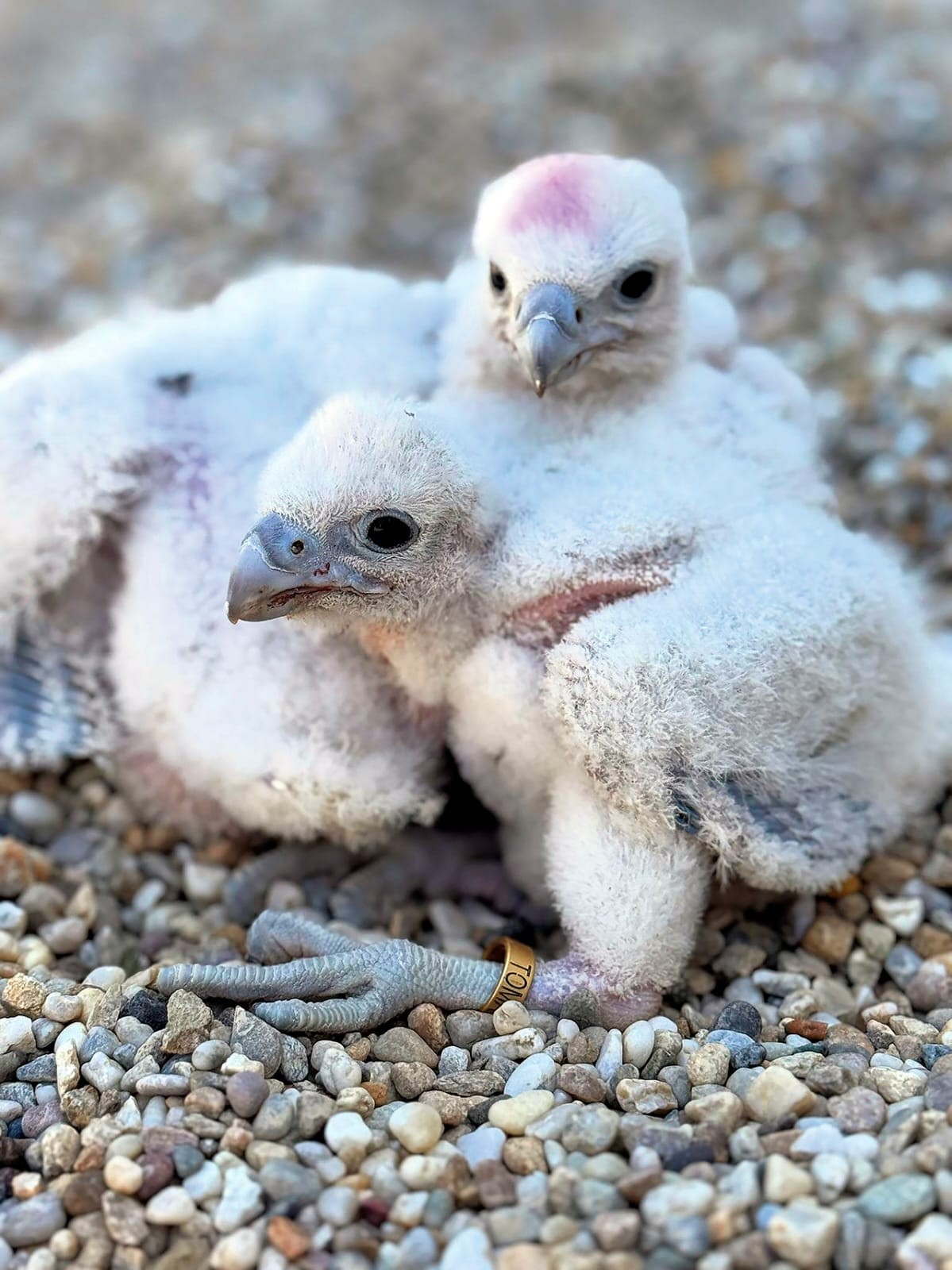 Tri mladé sokoly, dve samičky a jeden samček, v každom hniezde si koncom júna ešte zvykali v Petržalke na nové prostredie. Boli zatvorené, denne ich navštevovali sokoliari, sledovali a kŕmili holubím mäsom. Neskôr ich už vypustili do sveta, nasledujúce dni ich budú monitorovať a aj ďalej im dávať potravu, aby si zvykli vracať sa späť do hniezda. Neskôr už budú loviť samy. Pýtam sa sokoliara, či sokolom neublíži konzumácia chorých holubov. Tvrdí, že holuby sú skôr prenášačmi chorôb a parazity majú najmä v črevách či pľúcach, zatiaľ čo sokol konzumuje prsné svaly. „Riziko pre sokola je minimálne. Povedal by som, že viac ohrozený je človek, ktorý necháva holubí trus na balkóne a keď sa zmení na prach, dýcha ho.“