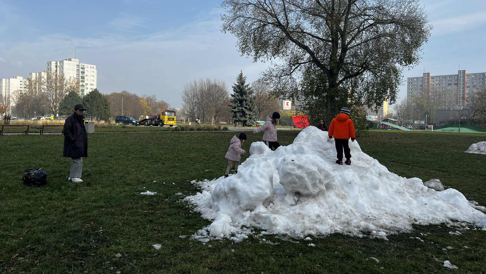 A hoci sa včera nenaplnili ľudové pranostiky a Martin na bielom koni na Slovensko neprišiel, o Petržalke to celkom neplatí. Neďaleko stromčeka, na tráve pred bankou sa totiž objavila aj kopa snehu, na ktorej už s radosťou šantili deti.