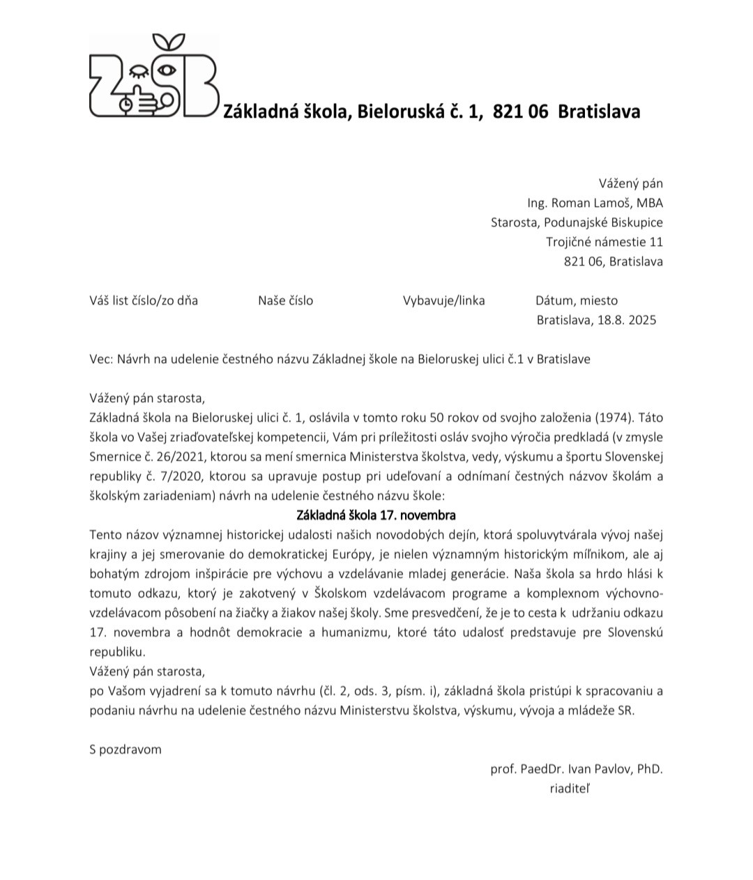 Ako ďalej informoval starosta, Základná škola Bieloruská oslávila tento rok 50 rokov od svojho založenia. "Verím, že sa dočká ešte jednej významnej pocty. Dnes sme pre to urobili dôležitý krok. Pre našu 'Bielku' sme navrhli pri príležitosti jubilea nový čestný názov, hlásiaci sa k jednému z najvýznamnejších dátumov našej histórie: Základná škola 17. novembra," uviedol Lamoš.