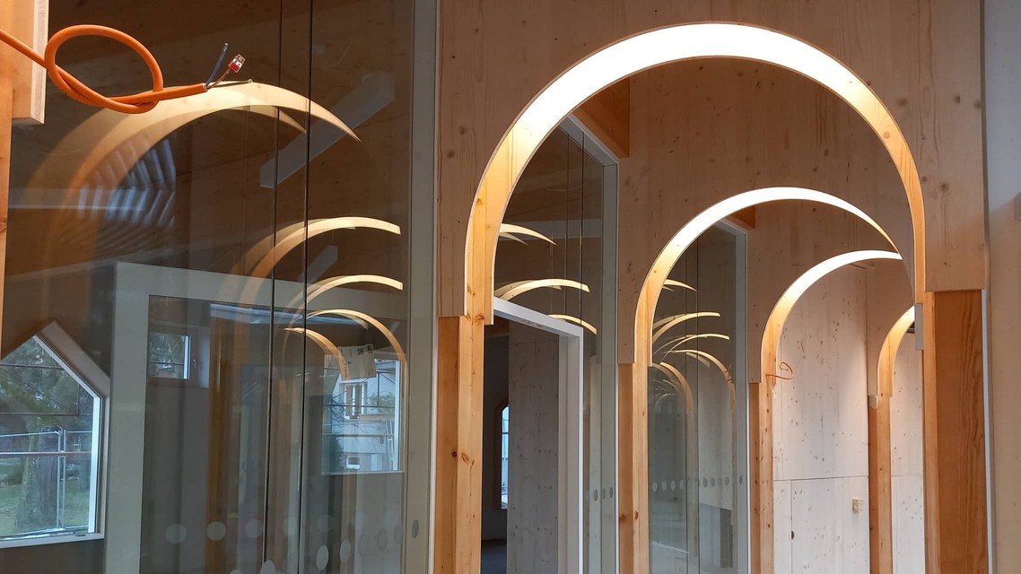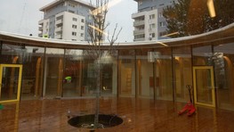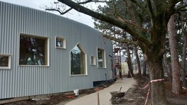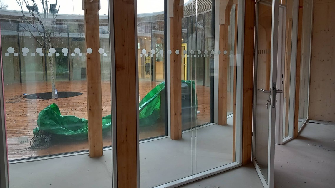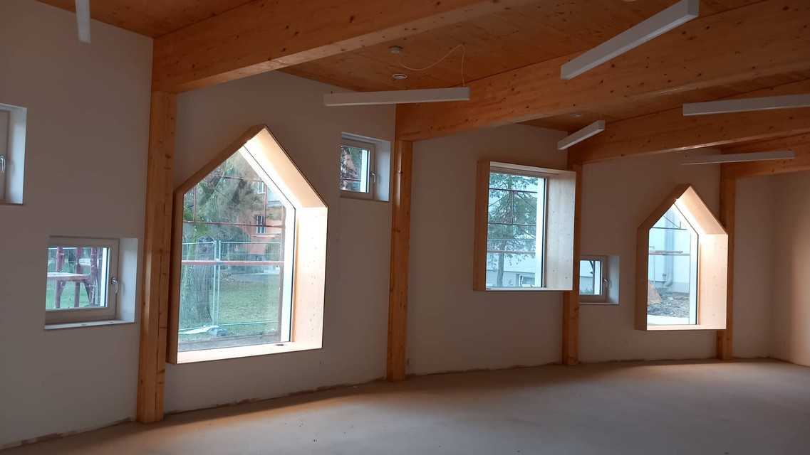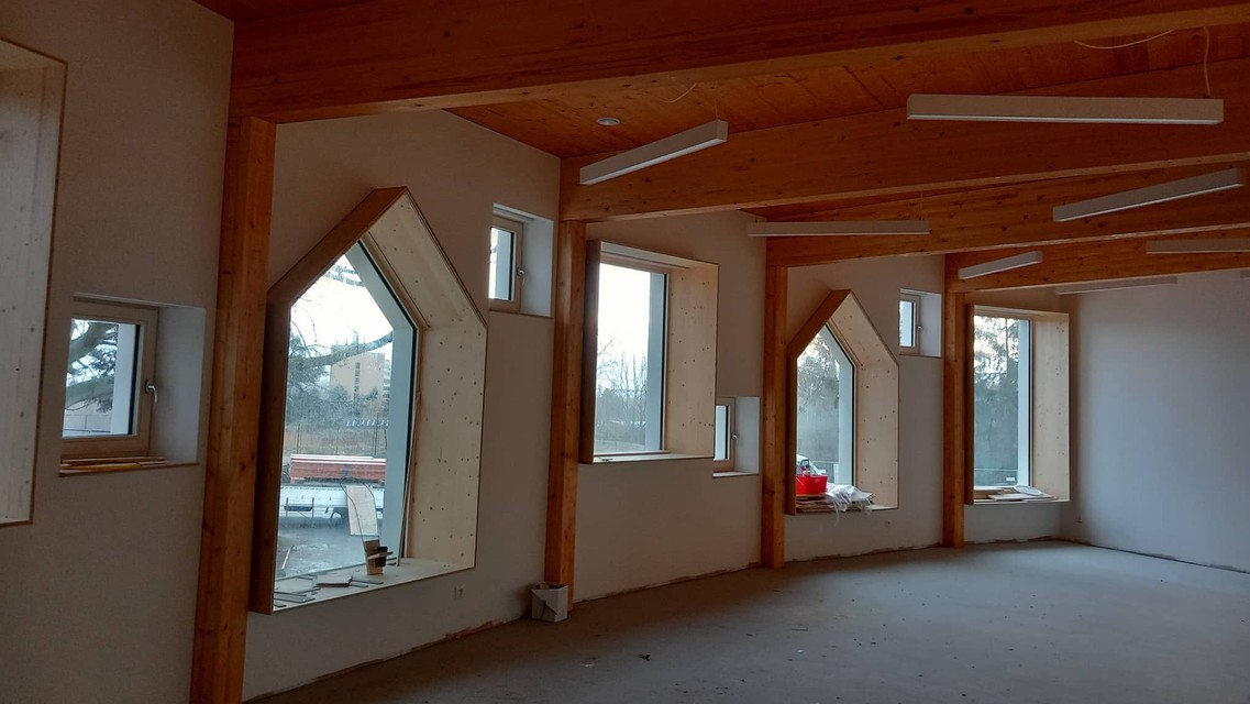 Nová škôlka má netradičný kruhový pôdorys, ide o drevenú stavbu, ktorá má zvnútra presklené steny. Personál tak bude môcť sledovať, čo sa deje aj na druhej strane objektu.