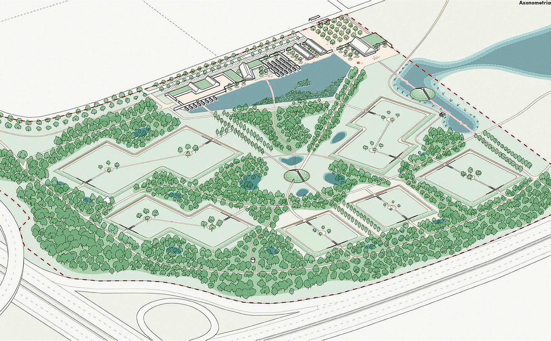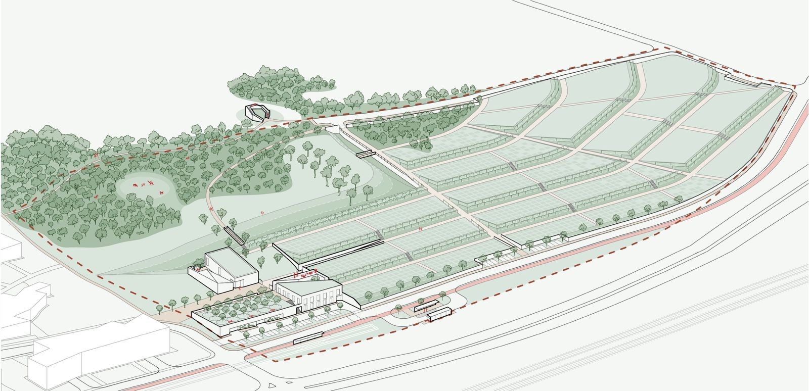 Navrhovaný areál je členený na tri hlavné časti: vstupnú s vybavenosťou a službami vrátane podzemného parkovania a reštaurácie s kaviarňou, hrobové polia a parkovú časť na najstrmších svahoch, ktorá bude voľne prístupná obyvateľom aj zveri. Od hrobových polí ju oddelí priekopa, ktorá zabráni vstupu zvierat do pietnych častí cintorína. Mimo areálu je potom navrhnutá rozhľadňa, ktorá sa stane súčasťou rekreačnej trasy a ponúkne panoramatické výhľady na krajinu aj cintorín.