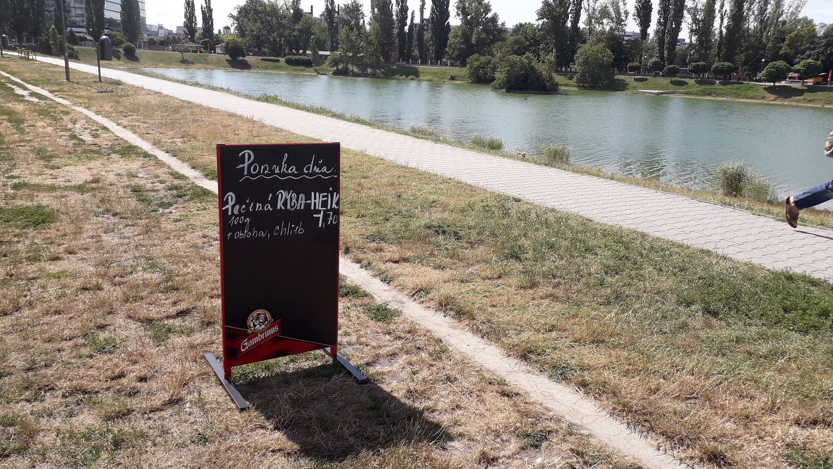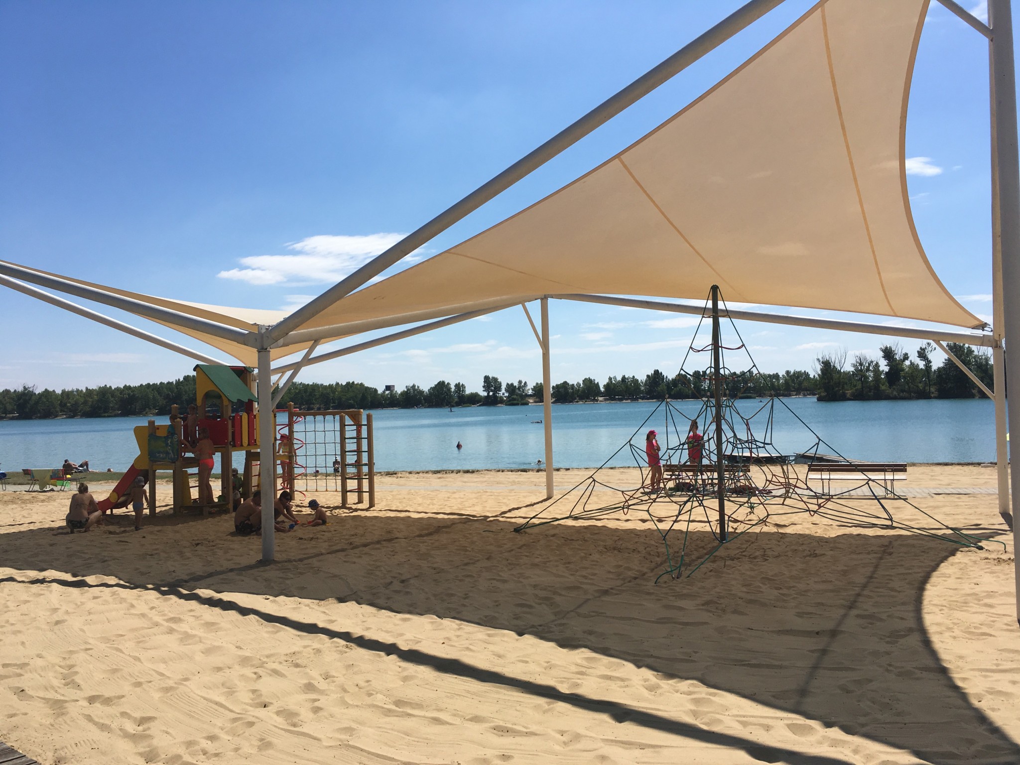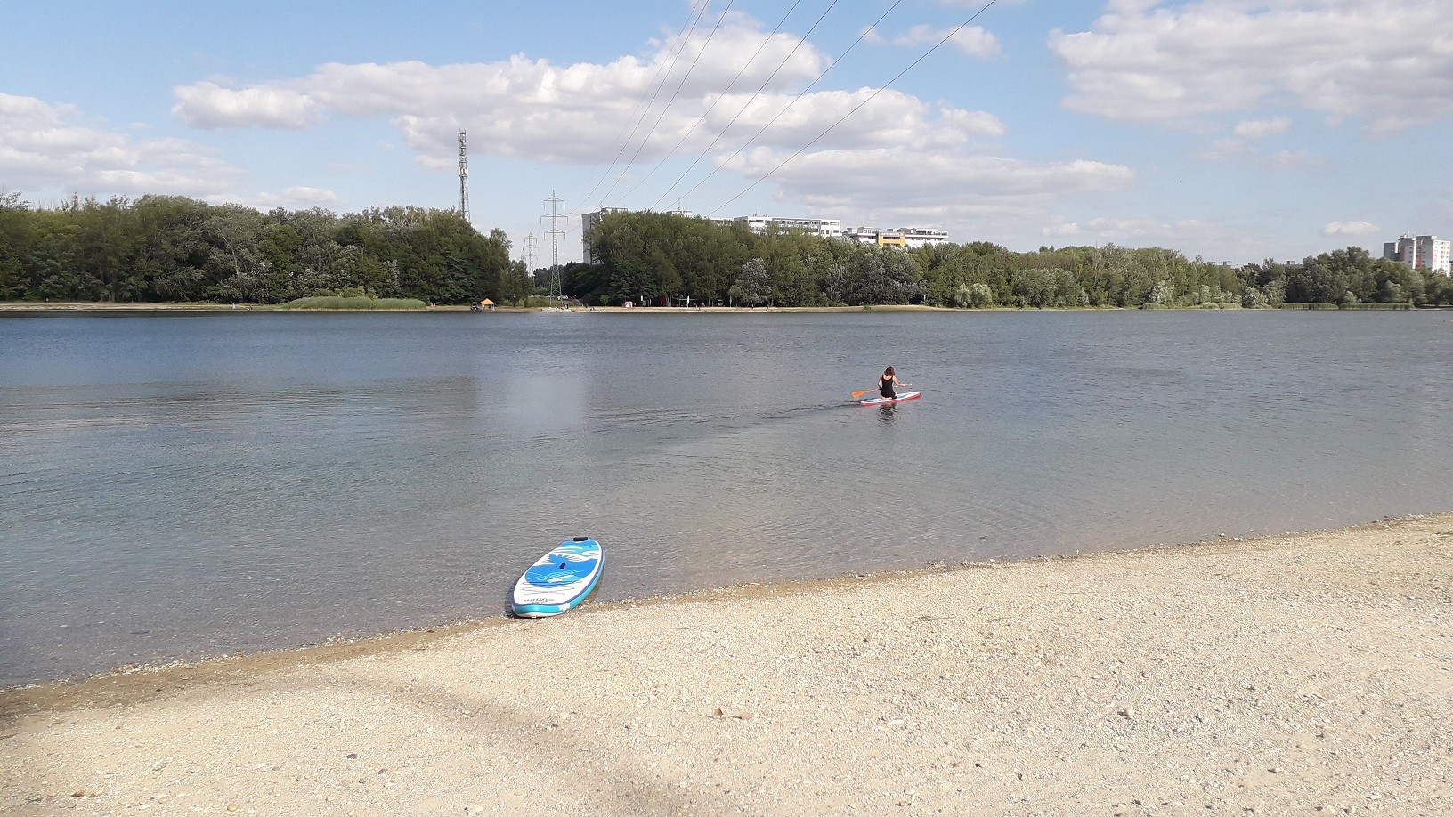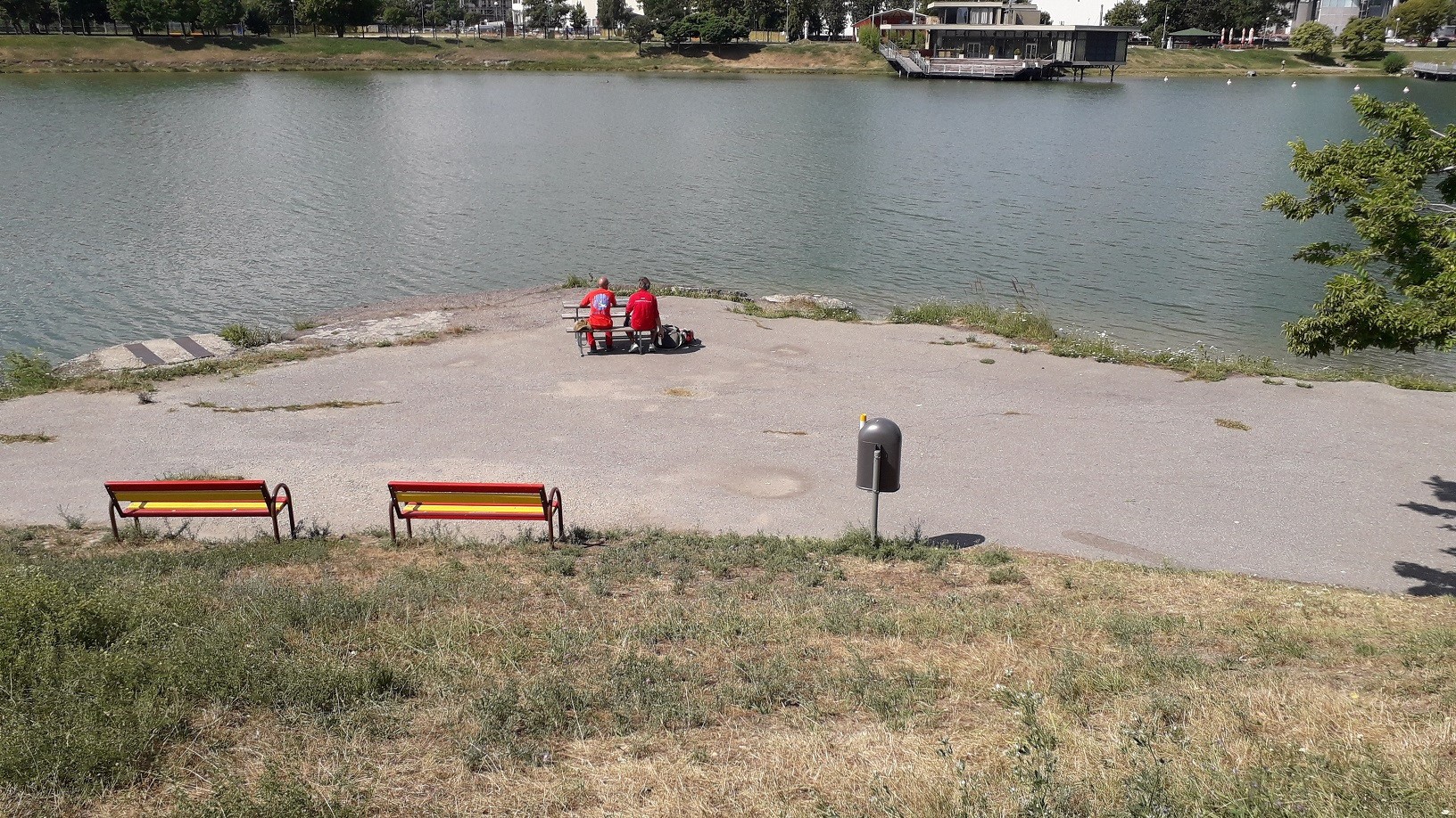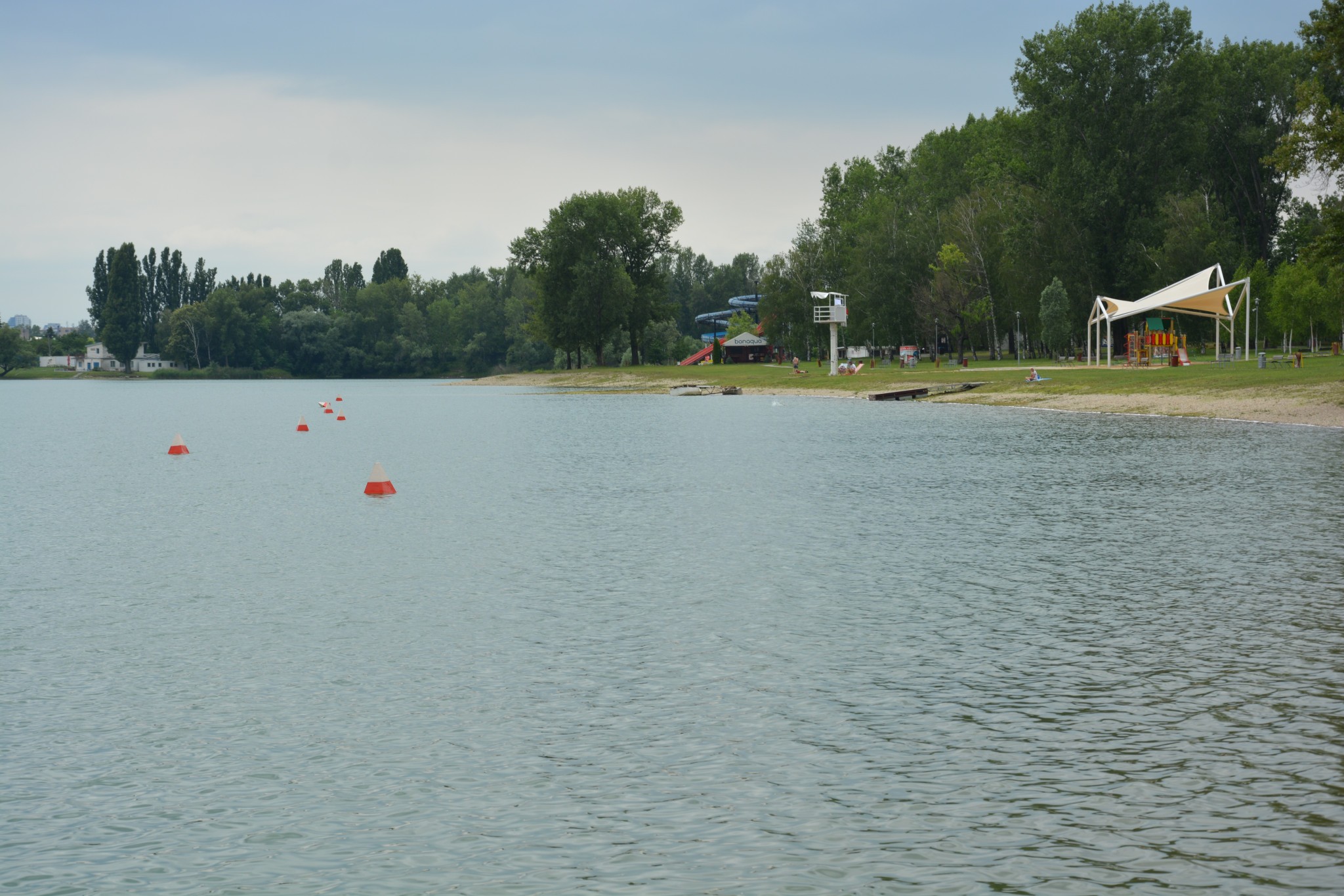 V týchto dňoch býva pri petržalskom jazere až do večera plno, zaplávať si sem chodia aj ľudia z iných mestských častí. A to napriek tomu, že brehy okolo jazera nie sú ani trávnaté, ani čisto štrkovité, skôr sa tam v tomto čase už s kamienkami mieša hlina a suchom spálená tráva...