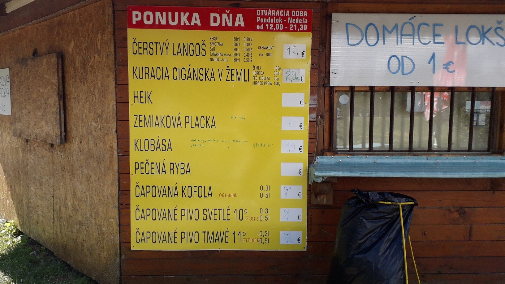 Kofola 1,50 €/0,5 l, kola 1,80 €/0,5 l, sóda:1,20 €/0,5 l, čapované pivo 1,50 €/0,5 l, radler 2 €/0,5 l,langoš 1,50 €/180 g, pečená ryba hejk 2,80 €/100 g, cigánska pečienka 4 €/120 g, pečená klobása 3,80 €/150 g, hotdog 1 €/165 g