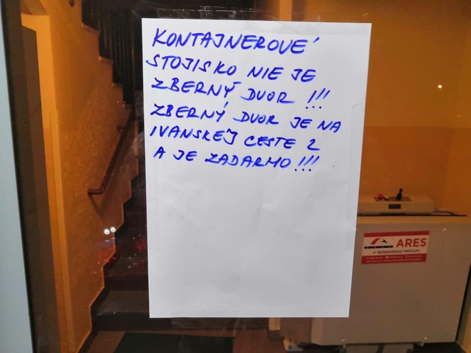 Poriadkumilovný sused vylepil na vstupné dvere do domu na Kozmonautickej ulici č.5 takéto písomné upozornenie...