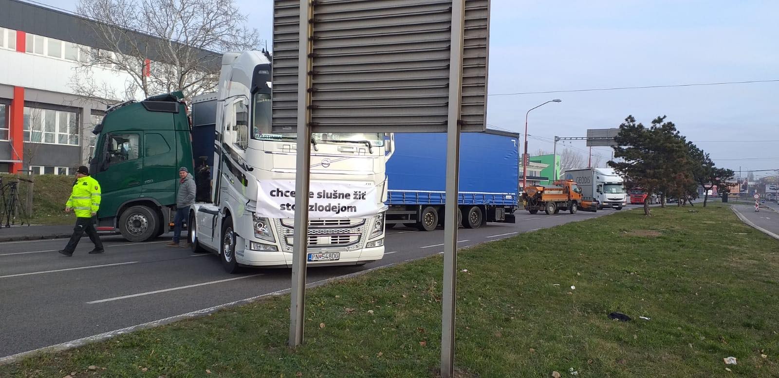 Na Rožňavskej v úseku medzi Tomášikovu a Turbínovou (pri Klientskom centre) sú odvčera v pravom pruhu odstavené kamióny vodičov, ktorí sa zapojilii do protestu. Z toho dôvodu bola cesta prejazdná iba pre MHD. Dnes ráno sme na mieste videli oveľa menej kamiónov ako včera, no časom sa rozhodli zablokovať celú cestu, keď ju s vozidlami prekrížili.