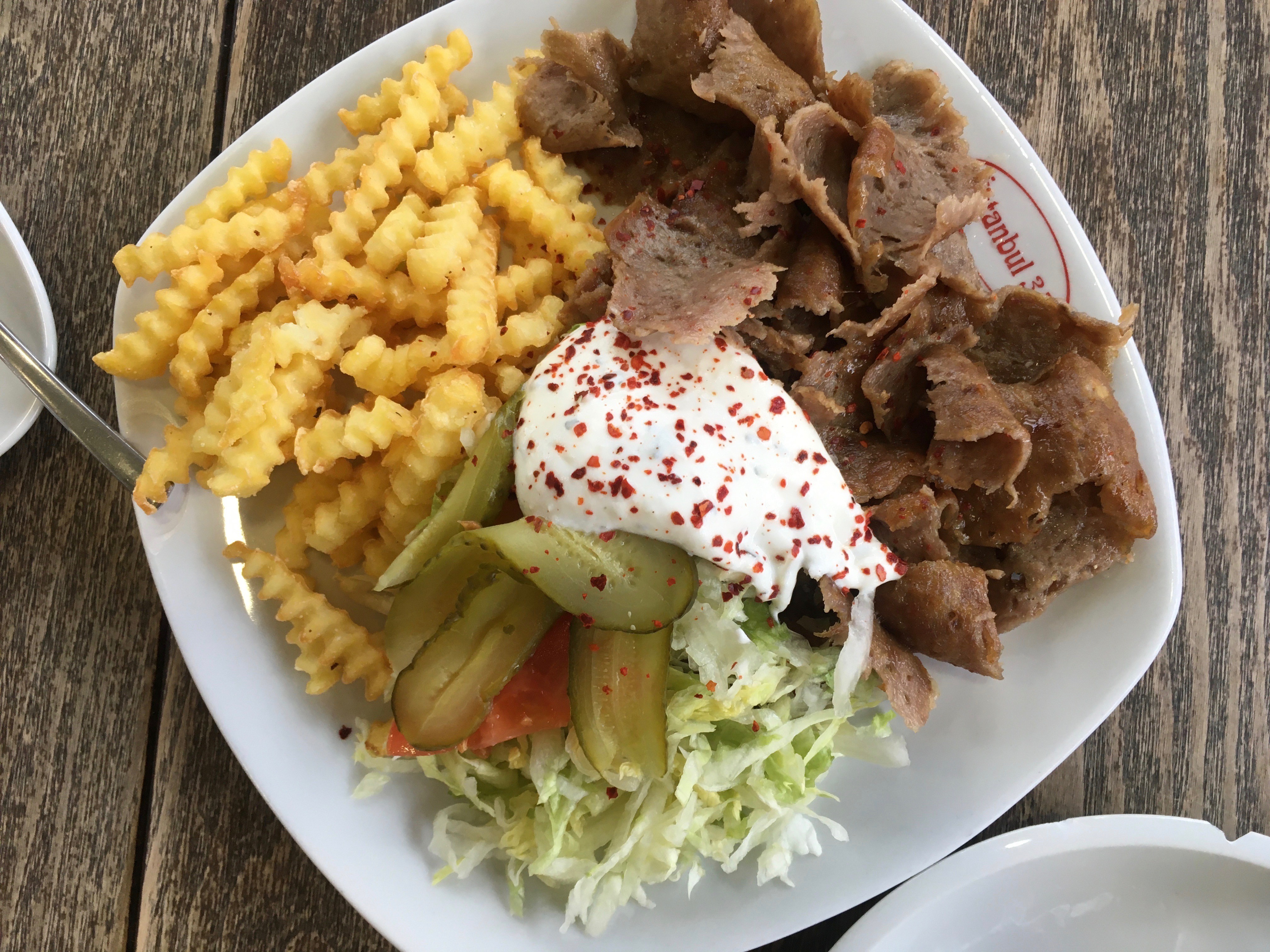 Teľací döner kebap na tanieri (6 eur) sme si objednali s hranolkami (alternatívou bola turecká ryža) a jogurtový dresing dali posypať čili korením, bolo pikantné tak akurát, nie príliš. K tomu typická zelenina – nakrájaná kapusta, plátky paradajky a kyslá uhorka, zriekli sme sa len cibule. Kebab chutil celkom dobre, no nie dokonale, mäso bolo totiž dosť mastné a mastné boli aj hranolky.