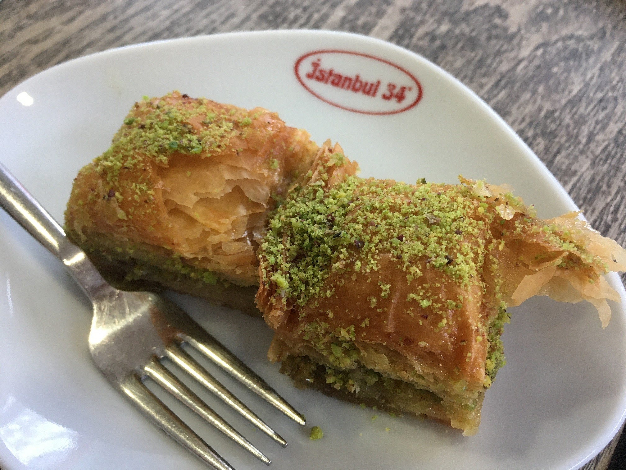 Baklava (1,50 eura) ako dezert bola výborná, vôbec nie presladená, ako sme sa obávali. Tento tradičný zákusok z tenučkých plátkov cesta, plnený posekanými orechami a sladený medom alebo sirupom, sme si dokonca vzali aj domov.