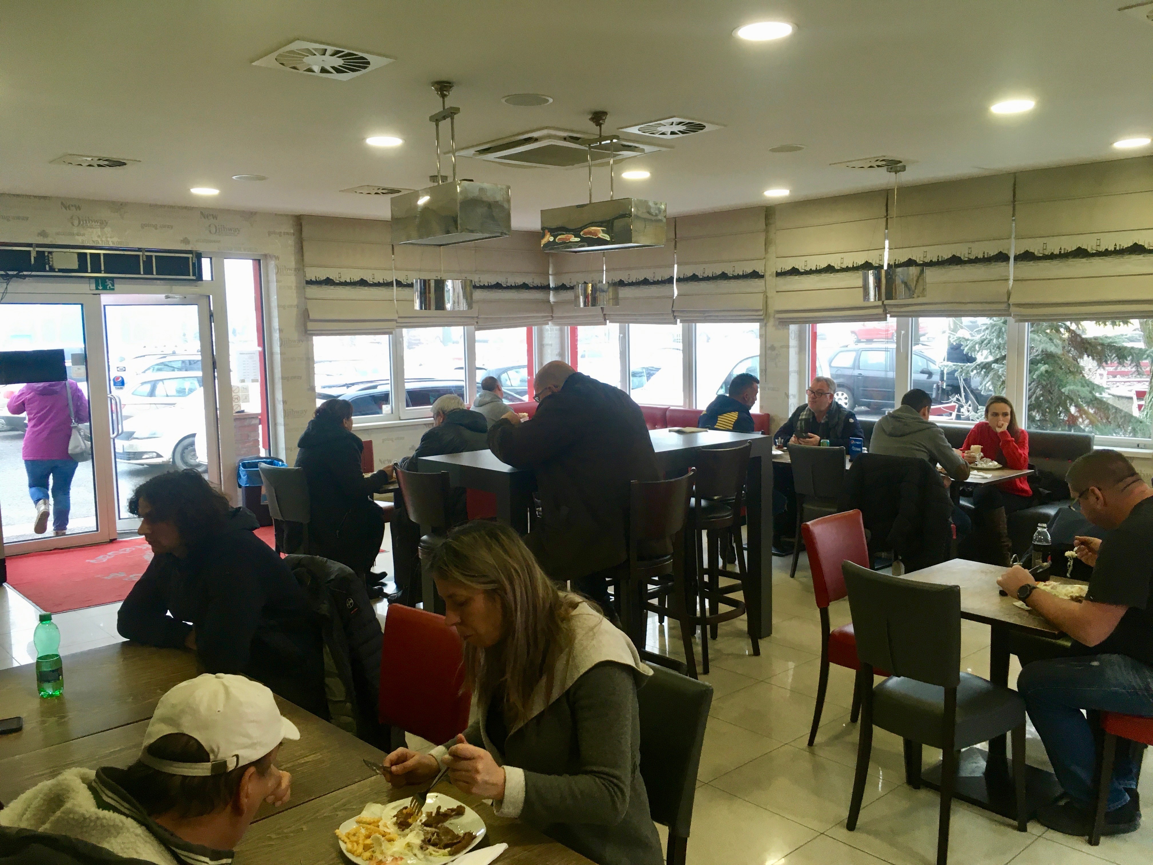 Oceňujeme tiež čisté a príjemné prostredie, všimli sme si, že obsluhujúci personál priebežne odnášal použité taniere a utieral stoly. Nevýhodou je, že sa nedá platiť kartou a nápoje majú len v plechovke v chladiacom boxe.