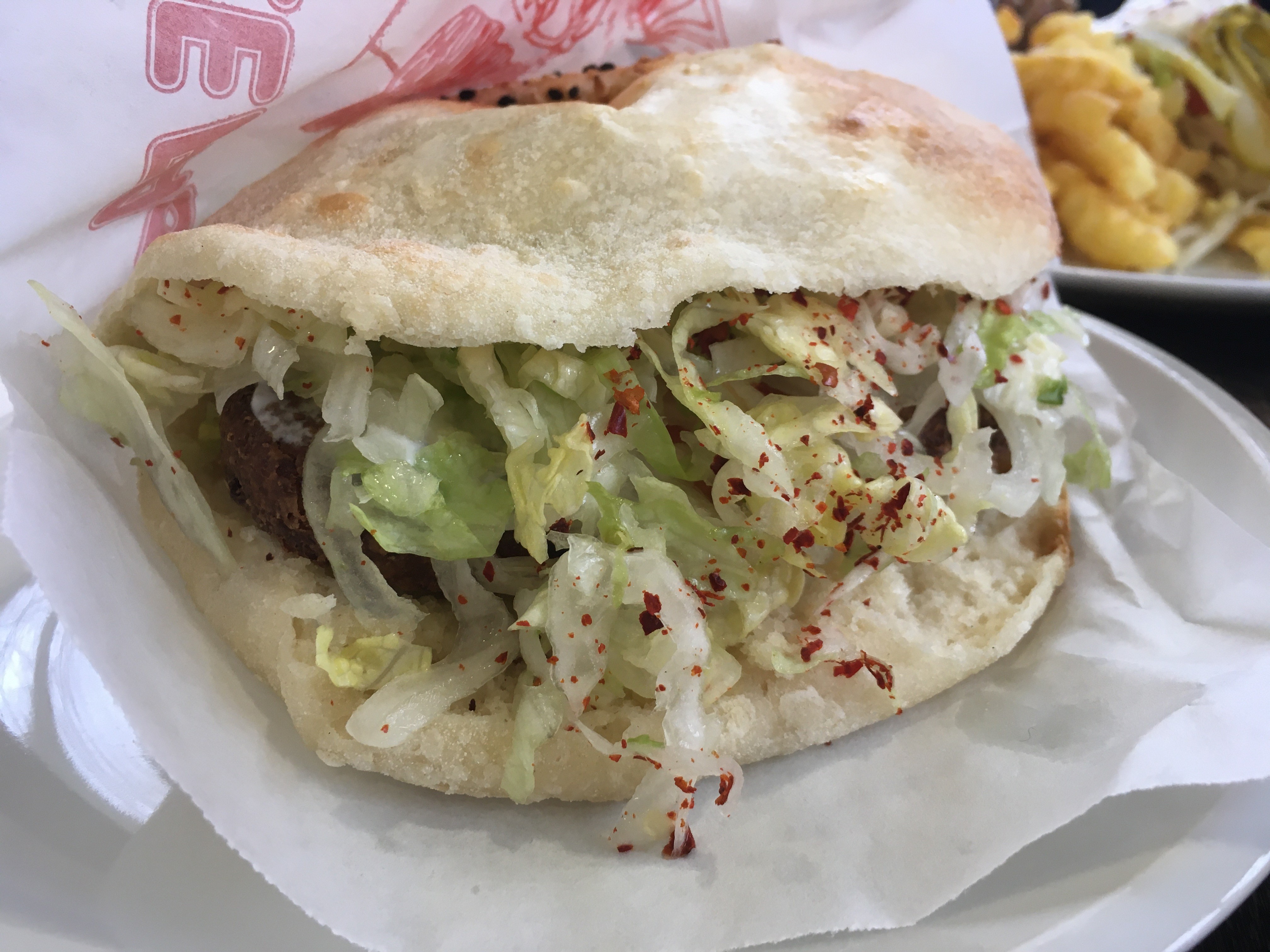 Falafel v tureckej žemli (3 eurá) nám pripadal trochu nevýrazný, vyprážané guľôčky - fašírky z rozomletého cíceru mohli byť chrumkavejšie. Lepší je s cibuľou, chuť je potom plnšia, pikantnejšia.