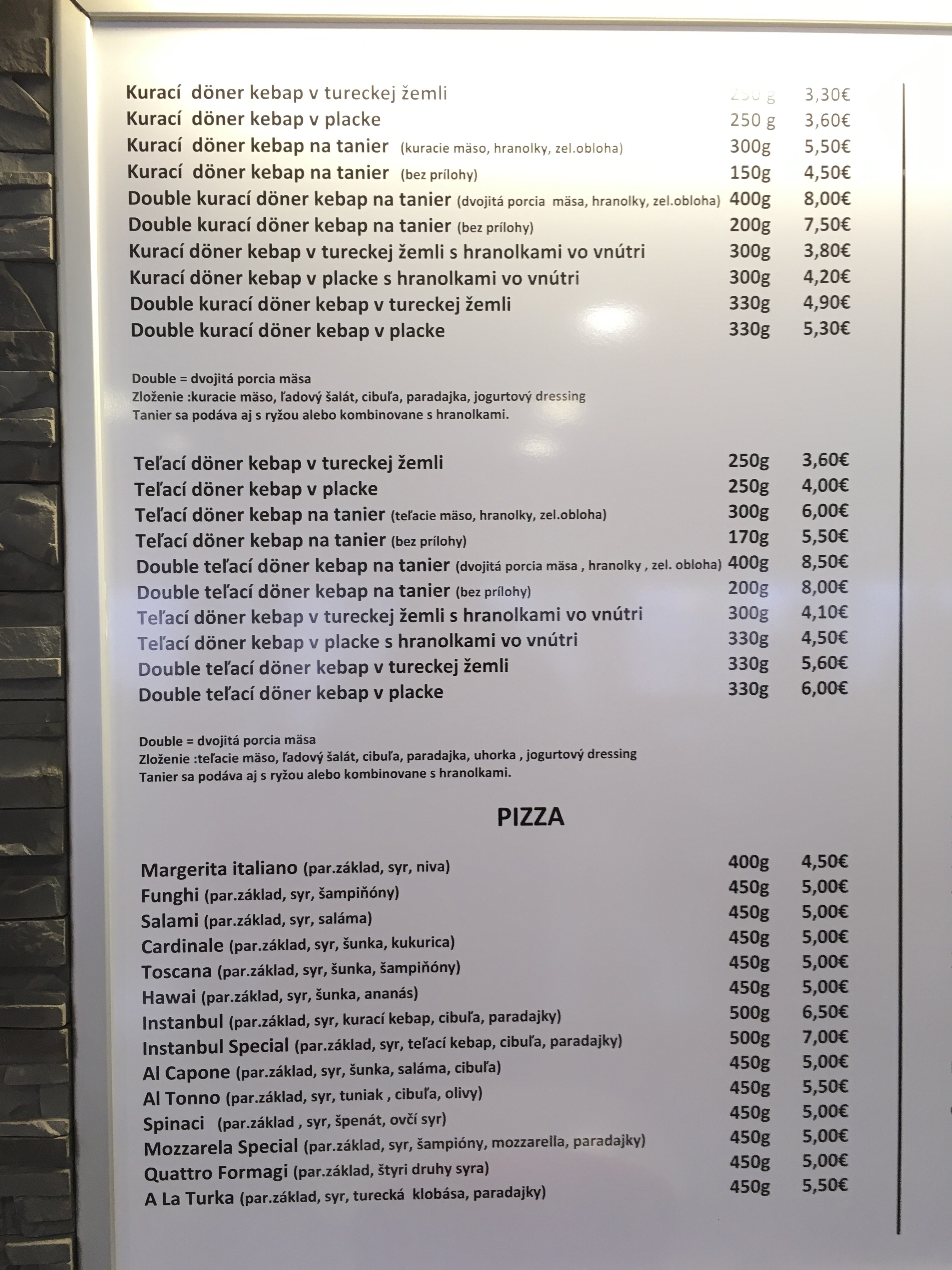 Ponuka tureckých špecialít je široká, zahŕňa aj niekoľko druhov polievok, ku ktorým podávajú žemľu, nechýba však ani pizza. My sme ochutnali päť jedál, porcie boli naozaj výdatné a cena rozumná. Kolegyňa, ktorá si pamätá úplné začiatky tohto fastfoodu, však konštatovala - štandard zariadenia bol síce kedysi nižší, ale jedlo chutnejšie.