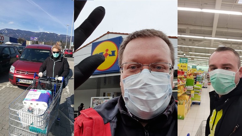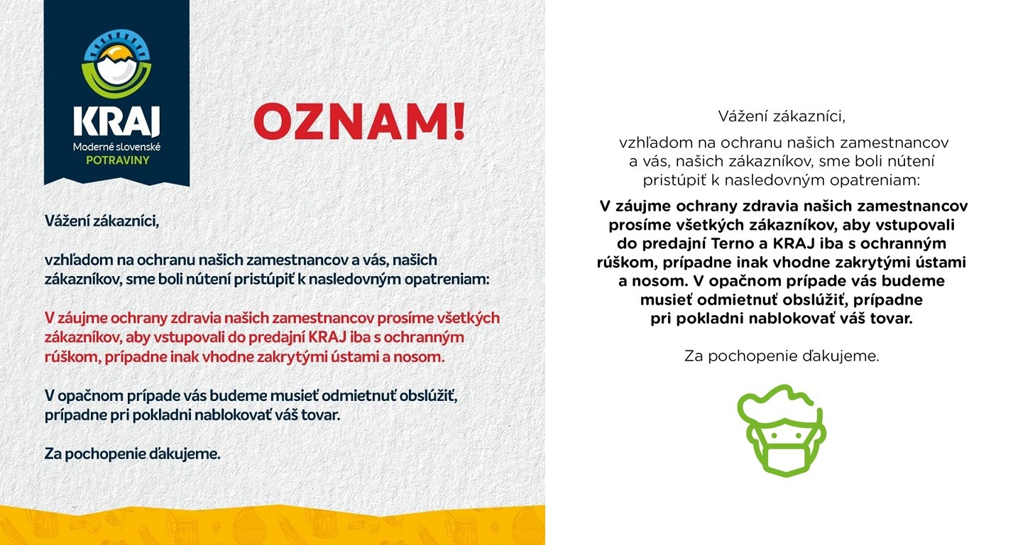 "Páni, nemôžete vôjsť dnu, ak nemáte rúška na tvári," kričala na nás pani od pokladne v potravinovej predajni Terno v komplexe Kozmos na Sputnikovej ulici. Ukázali sme jej palec hore, vycúvali z dverí až vtedy sme si všimli, že tento zákaz je v písomnej forme vylepený aj na oboch stranách hlavného vchodu do obchodu. Z autolekárničky sme vybrali trojrohú šatku a vyrobili si z nej provizórne rúška na tváre. Pokladníčka bola spokojná a pochválila nás za pohotovosť. Následne sme zistili, že k rovnakému kroku pristúpil nielen potravinový reťazec Terno, ale aj Kraj, o čom informovali zákazníkov nielen nápismi priamo na predajniach, ale aj prostredníctvom sociálnej siete...