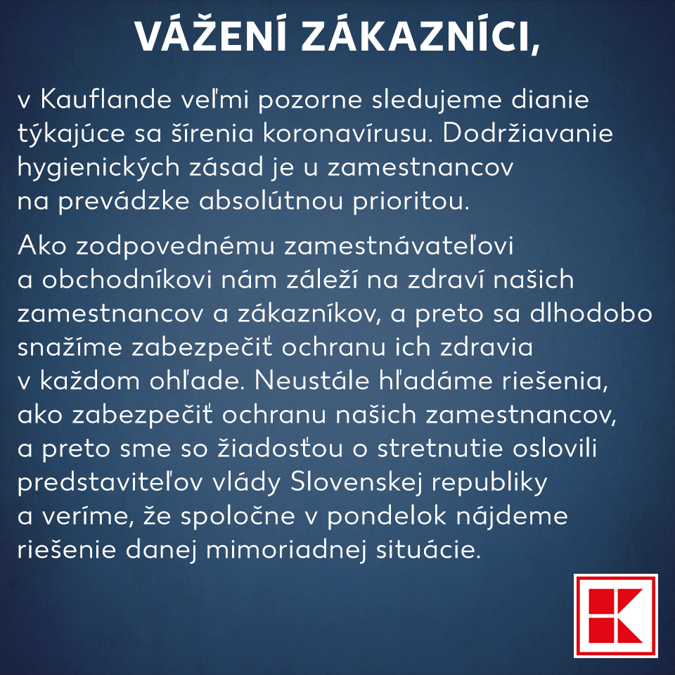 Takéto oznámenie zverejnil v piatok Kaufland na svojej FB stránke. Vyplýva z neho, že aj tento reťazec sa spolieha na vládu SR, že im s ochranou ich zamestnancov nejako pomôže. Premiér Peter Pellegrini sa však cez víkend vyjadril v tom zmysle, že pre štát je prioritné zdravotníctvo a ochranné prostriedky určené na zásobovanie nemocníc, lekárskych ordinácií a nie súkromný sektor.