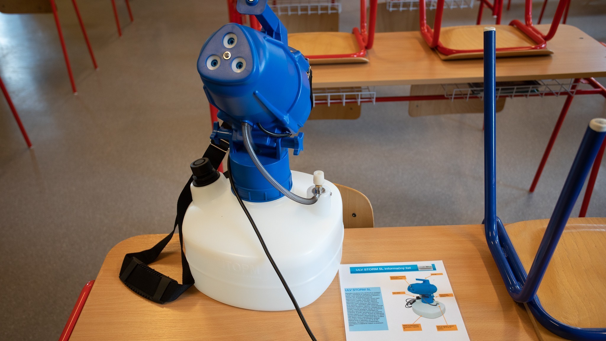 Generátor studenej hmly, napojený na elektrinu, sa postará o dezinfekciu všetkých povrchov v triede v priebehu dvoch minút, ako aj o vyčistenie vzduchu. V každej triede ho budú používať pravidelne dvakrát denne, aby zlikvidoval všetky baktérie a vírusy. „Peniaze naň sme nemali, no podarilo sa mi vybaviť, aby sme ho dostali do prenájmu na jeden mesiac. Je to overený prístroj s certifikátom, máme záruku, že nerozprašuje nijaké škodlivé chemikálie,“ ubezpečuje riaditeľka Erika Drgoňová.