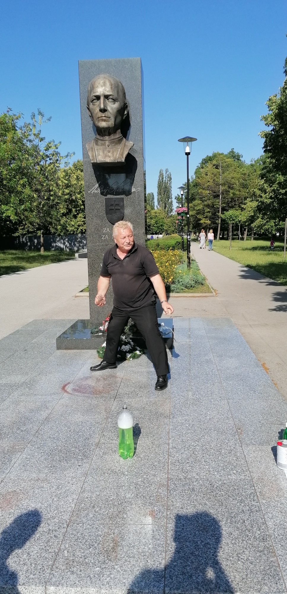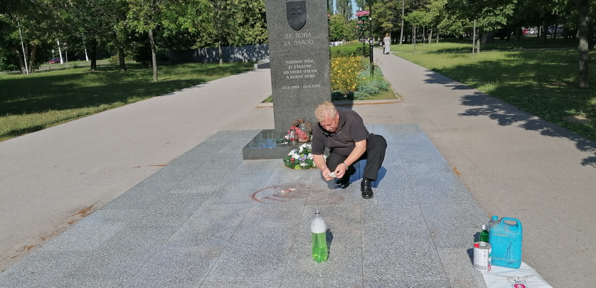 Keď sme prišli na miesto, pomník práve čistil pán Ľubomír Krampl. "Som radový člen SNS a pracujem s farbami, teda ich viem aj odstrániť. A preto keď dostanem avízo, že niekto poškodil pamätník nejakého slovenského národného dejateľa, pokladám si za povinnosť dať to do poriadku," vysvetlil nám. Sprevádzala ho i manželka Dagmar, ktorá je predsedníčkou krajskej organizácie strany v Bratislave.