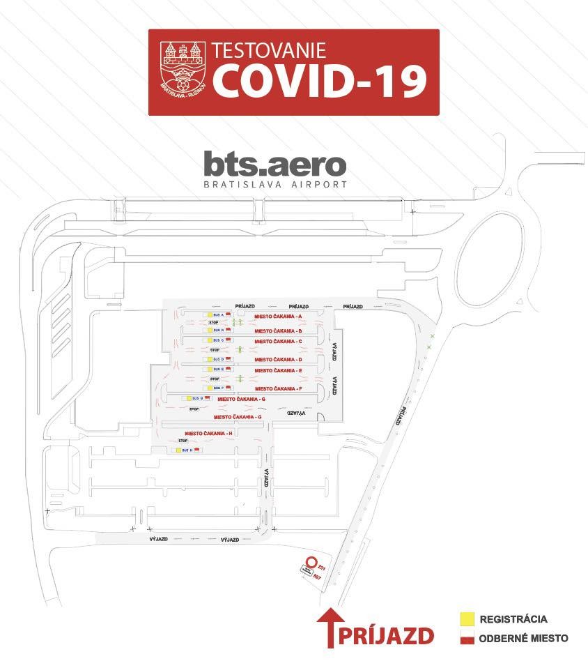 Mapka organizácie dopravy pri testovaní na letisku. Na testovanie na letisku nie je možnosť objednania sa