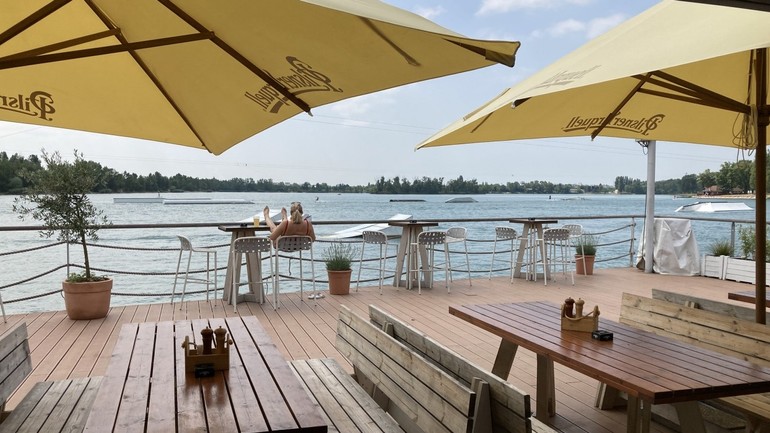 Stoly na terase pri vode boli krátko predpoludním ešte voľné, takže sme si mohli vyberať, kde je najväčší tieň, páliace slnko nevyhovuje každému. Najmä ak sa prídete iba najesť a len zdiaľky sledujete wakeboardistov jazdiacich na jazere. No už samotné posedenie v tomto prostredí má svoje čaro, vyvoláva príjemný pocit, že ste na dovolenke.