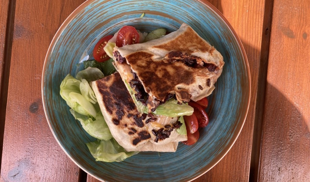 Veggie burrito so šalátom a s cherry paradajkami (7,90 €) sme si vybrali ako jedno zo šiestich hlavných jedál, ktoré boli v ponuke pri hlavnom bare (grilovaná hovädzia roštenka sa stihla minúť). Obavy, že náplň v placke bude suchšia, sú zbytočné. Fazuľky spolu s čiernou ryžou a syrom boli chutné a šťavnaté, tortila upečená dochrumkava, spolu s paradajkami a čerstvým listovým šalátom nám toto jedlo spríjemnilo deň.