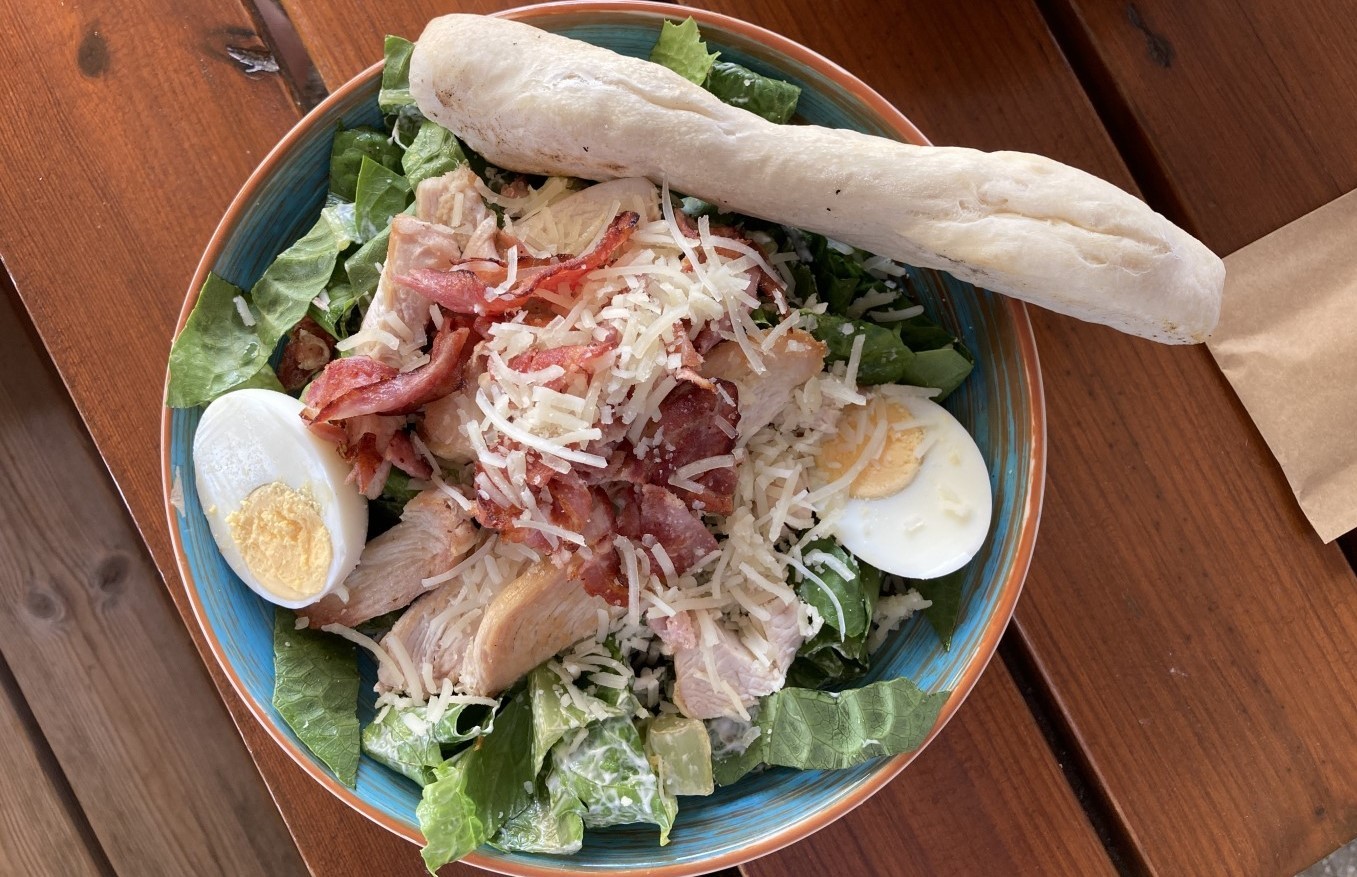 Cézar šalát (7,50 €) chutil presne tak, ako chutiť má. Obsahoval štedrú porciu chrumkavého kuracieho mäsa a slaninky, vajíčko, namiesto krutónov k nemu dostanete dochrumkava upečenú pizza štangľu.